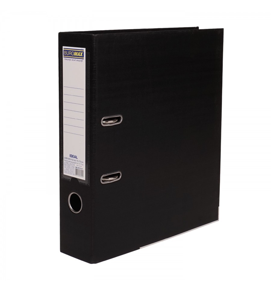 Реєстратор двосторонній IDEAL від BUROMAX - для зберігання та архівації документів у ділових та офісних процесах. Може використовуватися офісами, архівними службами, навчальними та комерційними установами, де потрібна систематизація та збереження документації.• Змінний двосторонній індекс на корінці для підпису • Кільце на корінці для зручного захоплення пальцями • Замки фіксації закритого положення • Двостороннє поліпропіленове покриття захищає обкладинку та вміст від вологи та механічних пошкоджень • Металевий протектор нижнього краю обкладинкиТехнічні характеристики• Формат – А4 • Ширина корінця робоча (внутрішня) – 70 мм, ширина габаритна (зовнішня) – 75 мм• Місткість – до 450 аркушів стандартної щільності 80 г/м² • Колір – чорний • Серія – IDEAL • Тип механізму – важільний механізм з притиском • Тип обкладинки – двостороння • Щільність картону обкладинки – 1500 г/м²Склад картон, поліпропіленова плівка, металеві деталі