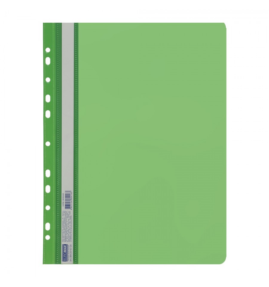 Папка-швидкозшивач з перфорацією від BUROMAX для систематизації, архівування та зберігання документів. Підходить для роботи з файлами та організації документопотоку. Може використовуватися офісними працівниками, державними установами, архівами, студентами та викладачами.Споживчі властивості та ознаки • Металевий швидкозшивач всередині (тип механізму "вусики") • Європерфорація – 11 отворів для сумісності з більшістю реєстраторів • Кишеня зі змінним індексом на лицьовій стороні • Має прозору верхню обкладину та кольорову нижню обкладинку з глянцевого пластику • Групове пакування: 12 шт. одного кольоруТехнічні характеристики Формат: A4 Товщина пластику: лицьова сторона – 120 мкм, нижня – 160 мкм Місткість – до 100 аркушів Колір - зеленийСклад Поліпропілен, метал