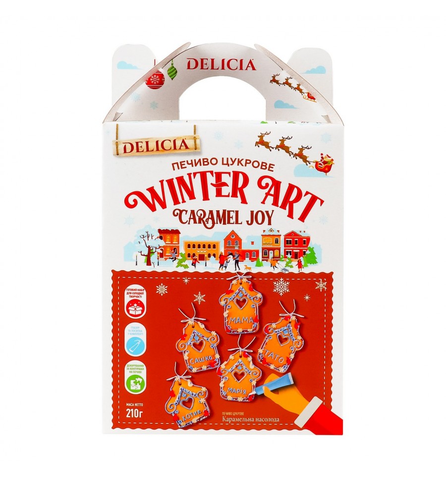 Печиво Delicia Карамельна насолода цукрове з ароматом тоффі 210г. Склад: борошно пшеничне, пудра цукрова, глазур цукрова для декору синього кольору (пудра цукрова, крохмаль кукурудзяний, патока, емульгатор Е516, барвник харчовий екстракт спіруліни, згущувач Е414, регулятор кислотності Е330, ароматизатор, згущувач Е440, консервант Е202), жир рослинний (пальмова олія негідрогенізована), глюкозно-фруктозний сироп, посипка цукрова (цукор, борошно пшеничне вищого сорту, олія пальмова рафінована, вибілена, дезодорована, патока крохмальна, Е1422, загущувачі: E412, E415, Е466, барвник E120, E553b, глазуруючий агент капол 1295, (карнаубський віск, бджолиний віск), Е414), розпушувач Е500, ароматизатори, сіль кухонна, барвник бета-каротин. Енергетична цінність продукту: 1820кДж/100г, 432ккал/100г. Поживна (харчова) цінність продукту: білки - 6.7г/100г, жири - 12.2г/100г, насичені жири - 5.7г/100г, вуглеводи - 72.5г/100г, з них цукри - 29.9г/100г, сіль - 0.7г/100г. Умови зберігання: зберігати за температури +13..+23ºC і відносній вологості повітря не більше 75%. Термін придатності: 1 рік. Країна виробник: Україна. Виробничі потужності та адреса виробничих потужностей: ПП Деліція, Заводська, 2-В, м. Буча, Київська обл., Україна, 08292. Маса нетто: 210г.
