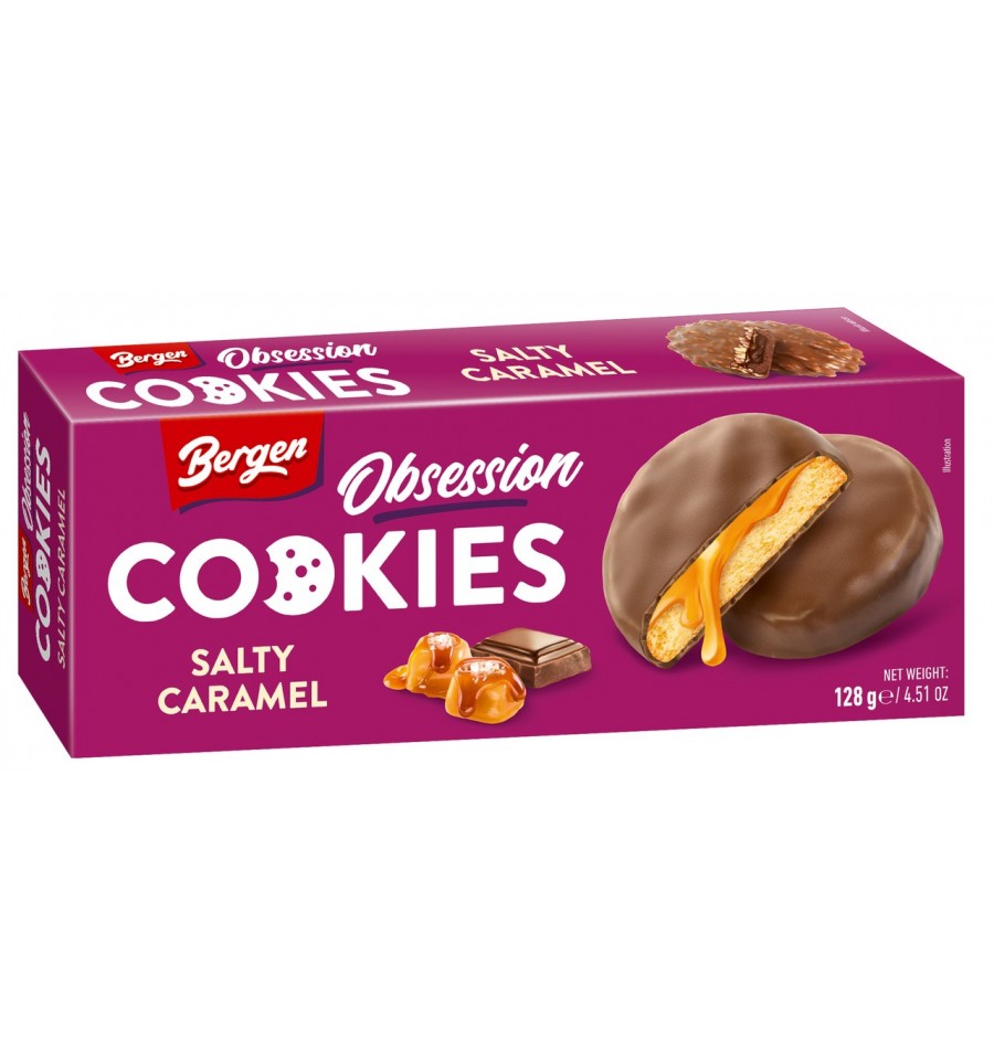 Печиво з солоною карамеллю вкрите молочним шоколадом «Bergen». Склад: борошно ПШЕНИЧНЕ, шоколад молочний 27% [цукор, МОЛОКО незбиране сухе, какао-масло, какао-паста, лактоза (з МОЛОКА), сироватка суха (з МОЛОКА), емульгатор: лецитин (СОЯ)], солона карамель 25% [глюкозно-фруктозний сироп, цукор, олія кокосова, МОЛОКО знежирене сухе, сироватка суха (з МОЛОКА), емульгатор: лецитин (СОЯ), ароматизатор, сіль], олії рослинні (пальмова, ріпакова), цукор, глюкозно-фруктозний сироп, ароматизатор, сіль, розпушувачі: бікарбонат амонію E503 (ii), бікарбонат натрію E500 (ii). Може містити ГОРІХИ, НАСІННЯ КУНЖУТУ та похідні продукти з них, ЯЙЦЯ. Енергетична цінність: 2034 кДж / 486 ккал; жири — 23,0 г, з них насичені — 17,0 г; вуглеводи — 61,0 г, з них цукри — 56,0 г; білки — 7,7 г; сіль — 0,45 г. Зображення на упаковці є ілюстрацією. Дата “Краще спожити до” та номер партії: зазначені на упаковці. Зберігати в сухому прохолодному місці. Країна походження: Польща. Імпортер: ТОВ «Метро Кеш енд Кері Україна», просп. П. Григоренка, 43, м. Київ, 02140, Україна, з питань щодо продукту звертайтеся за тел. гарячої лінії імпортера: 0 800 501 401 (безкоштовно в межах України). Маса нетто: 128 g (г)