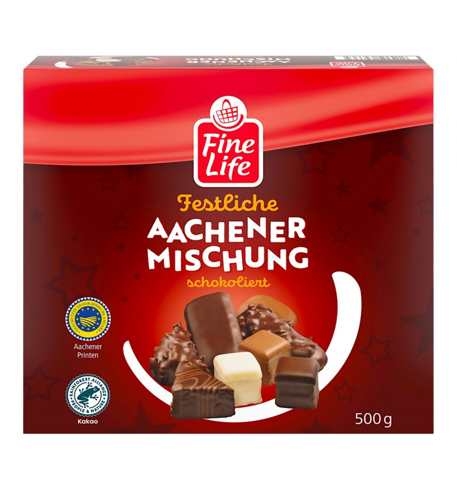 Асорті пряників, глазурованих шоколадом (20% темного шоколаду, 5% молочного шоколаду, 2% білого шоколаду) ТМ “Fine Life”. Склад: цукор, борошно пшеничне, глюкозно-фруктозний сироп, какао терте, коричневий цукор, какао-масло, мед натуральний, лісові горіхи, яблучне пюре, карамельний цукор, абрикосові кісточки, молоко сухе незбиране, розпушувачі: карбонати натрію, карбонати калію; прянощі, кориця, суха солодка сироватка (молоко), цедра лимона, молочний жир (молоко), інвертний цукровий сироп, молоко сухе знежирене, кислота лимонна, кислота цитрат натрію; цедра апельсина, емульгатор: лецитин; желюючий агент: пектин, агар-агар; вологоутримувальний агент: сорбіт, інвертаза; натуральний ароматизатор, екстракт яблука, сіль, картопляний крохмаль. Продукт може містити сліди інших горіхів, арахісу, яєць, люпину, кунжуту та сої. Поживна цінність на 100 г продукту: енергетична цінність - 1733 кДж, 412 ккал; жири - 12 г, з них насичені - 6,6 г; вуглеводи - 66 г, з них цукри - 46 г; білки - 5,8 г; сіль - 0,58 г. Дата “Краще спожити до” та номер партії: зазначено на пакованні. Умови зберігання: зберігати в сухому прохолодному місці, захищеному від прямих сонячних променів. Країна походження: Польща. Імпортер: ТОВ «Метро Кеш енд Кері Україна», просп. П. Григоренка, 43, м. Київ, 02140, Україна. З питань щодо продукту звертайтеся за телефоном імпортера: 0 800 501 401 (безкоштовно в межах України). Маса нетто: 500 г.