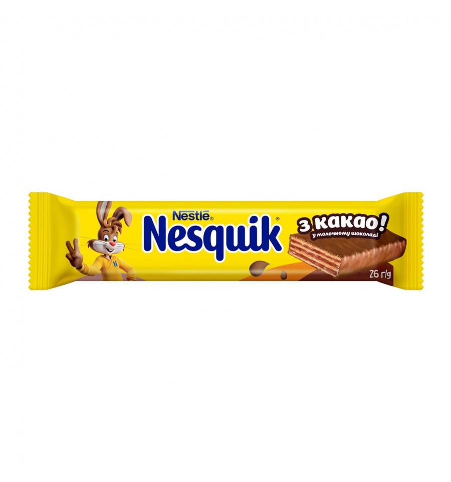 Вафлі Nesquik у молочному шоколаді з какао 2*13г/уп. Склад: цукор, борошно пшеничне (містить глютен), олія пальмова, какао-масло, сироватка молочна суха, какао терте, молоко сухе незбиране, крохмаль, какао-порошок зі зниженим вмістом жиру (1.2%), молочний жир, молоко сухе знежирене, емульгатори (лецитини, Е476), сіль кухонна, розпушувач (гідрокарбонат натрію), крохмаль пшеничний (містить глютен), натуральний ароматизатор, поліпшувач борошна (сульфат кальцію). Енергетична цінність продукту: 2155кДж/100г, 515ккал/100г. Поживна (харчова) цінність продукту: білки - 4.9г/100г, жири - 26г/100г, насичені жири - 12г/100г, вуглеводи - 64г/100г, з них цукри - 46г/100г, сіль - 0.34г/100г. Умови зберігання: зберігати за температури +18 (+/-5)ºC і відносній вологості повітря не більше 75%. Термін придатності: 10 місяців. Країна виробник: Україна. Виробник та адреса виробника: Філія ТОВ Нестле Україна Львів, вул. Ткацька, буд. 10, м. Львів, Україна, 79019. Кількість: 2шт. Маса нетто: 26г.