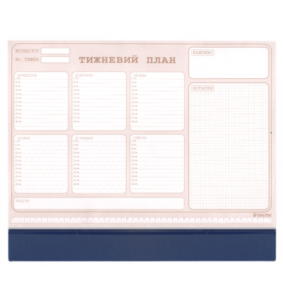 Настільний тижневий планінг Panta Plast - помічник для ділового планування, який стане додатковим атрибутом робочого столу, як в офісі, так і вдома. Призначений для коротких заміток і складання розкладу на день. Допомагає систематизувати особисті і робочі справи, зберегти потрібну інформацію і будувати плани на майбутнє. Незамінний в плануванні оперативних і стратегічних завдань Не ковзає на гладких поверхнях На одній сторінці - цілий тиждень, органайзер робочого часу до 18.00 Є місце для нотаток Недатований Паперовий блок на 30 аркушів щільністю 80 г / м2 Тверда захисна планка з PVC Розмір 470х335мм