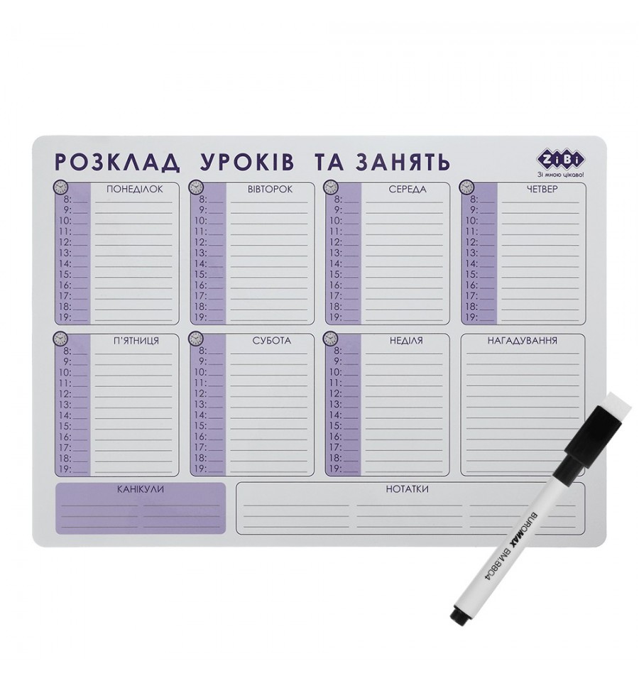 Комплект Настінний магнітний дитячий планер + маркер від ZiBi- сучасне зручне та ефективне рішення для планування та візуалізації розкладу. Виконаний у стриманих кольорах, що не відволікають, підійде до будь-якого інтер'єру.формат А3 (розмір 425х305х5 мм) орієнтація горизонтальна біла поверхня, має лініювання для запису розкладу занять та справ з 8 до 19 години на кожен день тижня, а також поля для фіксації додаткової інформації покриття спеціальною ПЕТ-плівкою, придатне для письма маркерами сухого стирання поверхня витривала до багаторазового використання, не дряпається, не створює неприємних скрипучих звуків при письмі основа з магнітного вінілу для кріплення планера на металеву поверхню в комплект входить міні-маркер сухого стирання чорного кольору, ширина лінії письма 1-2 мм, з вмонтованою губкою для стирання та магнітом для кріплення на металевій поверхні