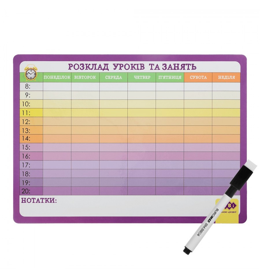 Комплект Настінний магнітний дитячий планер + маркер від ZiBi – сучасне зручне та ефективне рішення для планування та візуалізації розкладу. Має яскравий кольоровий дизайн.формат А3 (розмір 425х305х5 мм) орієнтація горизонтальна кольорова поверхня, має лініювання для запису розкладу занять та ін. заходів з 8 до 20 години на кожен день тижня, а також поле для фіксації додаткової інформації покриття спеціальною ПЕТ-плівкою, придатне для письма маркерами сухого стирання поверхня придатна для багаторазового використання, не дряпається, не створює неприємних скрипучих звуків під час письма основа з магнітного вінілу для кріплення планера на металеву поверхню в комплект входить міні-маркер сухого стирання чорного кольору, ширина лінії письма 1-2 мм, з вмонтованою губкою для стирання та магнітом для кріплення на металевій поверхні