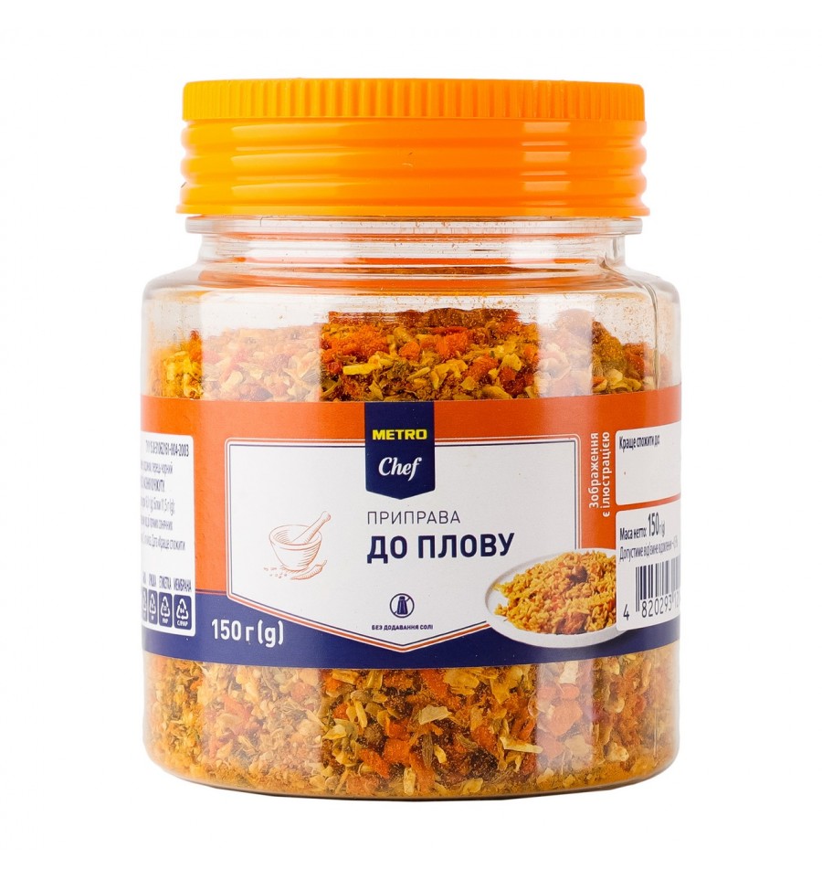 Приправа Metro Chef до плову 150г. Склад: цибуля ріпчаста сушена мелена, часник сушений мелений, морква сушена подрібнена, коріандр подрібнений, паприка, куркума, томати сушені мелені, родзинки, перець чорний мелений, кумин, зелень кропу сушена подрібнена, перець чилі мелений. Енергетична цінність продукту: 1485кДж/100г, 351ккал/100г. Поживна (харчова) цінність продукту: білки - 11.5г/100г, жири - 5.5г/100г, насичені жири - 0.8г/100г, вуглеводи - 63.9г/100г, з них цукри - 16г/100г, сіль - 0.2г/100г. Рекомендований спосіб приготування/вживання: використовувати для приготування плову, додавати 1-2 ст. ложки приправи до плову на 1.5кг м`яса. Умови зберігання: сухе, чисте місце, далеко від джерел тепла, без потрапляння прямих сонячних променів. Термін придатності: 2 роки. Країна виробник: Україна. Оператор ринку та адреса оператора ринку: ПП СПС, просп. Любові Малої, 93, м. Харків, Україна, 61020. Маса нетто: 150г.