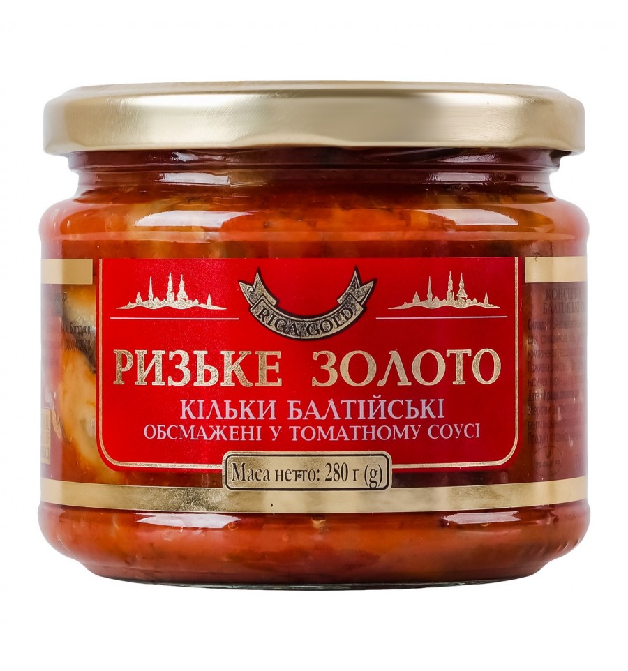Кільки Ризьке золото балтійські обсмажені у томатному соусі 280г. Склад: риба кілька балтійська - не менше 55%, соус - не менше 10% (томатна паста, цукор, борошно пшеничне, олія соняшникова, сіль, цибуля ріпчаста, приправи, кислота оцтова харчова). Без ГМО. Енергетична цінність продукту: 431.1кДж/100г, 103.2ккал/100г. Поживна (харчова) цінність продукту: білки - 6г/100г, жири - 6г/100г, насичені жири - 2.2г/100г, вуглеводи - 6.3г/100г, з них цукри - 3.6г/100г, сіль - 1.1г/100г. Рекомендовані способи застосування/вживання: продукт готовий до вживання. Умови зберігання: зберігати за температури 0..+25ºC і відносній вологості повітря не більше 75%. Чисте, добре вентильоване місце, без потрапляння прямих сонячних променів. Термін придатності: 42 місяці. Країна виробник: Україна. Виробник та адреса виробника: ТОВ Рибоконсервний завод Екватор, вул. Різдвяна, 29А, кімн. 901, м. Харків, Україна, 61052. Адреса виробничих потужностей: вул. Залізнична, 14, м. Богодухів, Харківська обл., Україна, 62102. Маса нетто: 280г.