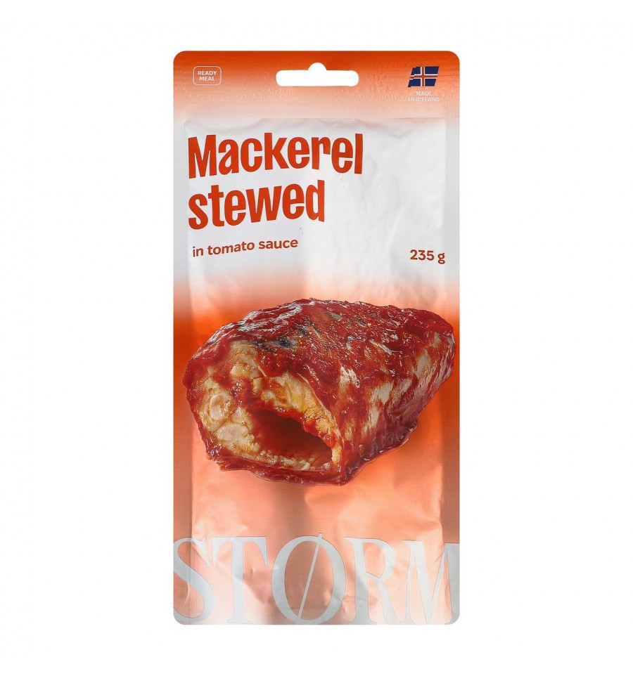 Cкумбрія томлена, в томатному соусі. Консерви рибні стерилізовані. Склад: скумбрія (Scomber scombrus) (60%), томатний соус (вода питна, томатна паста, цукор, олія рослинна (ріпакова або соняшникова), цибуля сушена, сіль кухонна, регулятор кислотності - оцтова кислота, чорний перець, духмяний перець, гвоздика, коріандр, лавровий лист) (40%). Країна походження: Ісландія. Маса нетто 235 г (g). Маса риби не менше 141 г (g). Допустиме від’ємне відхилення від маси нетто становить 9 г (g). Поживна цінність на 100 г (g) продукту: Енергетична цінність : 1055 кДж (kJ) / 253 ккал (kcal), Жири 17,1 г (g), з них насичені 4,8 г (g), Вуглеводи 7,6 г (g), з них цукри 7,2 г (g), Білки 17,1 г (g), Сіль 2,1 г (g). Умови зберігання: зберігати за температури від 0 °С до +25 °С. Після відкриття зберігати за температури від 0 °C до +5 °C та спожити протягом 2 діб. Виробник та адреса потужностей виробництва: «Ісстормур» ЕХФ, Скаларейкьявегі 12, 250, Судурнесябаєр, Ісландія. Реєстраційний номер потужності: H135. Імпортер/підприємство, яке приймає претензії від споживачів, його адреса: ТОВ «Стронг Груп», вул. Небесної Сотні, буд. 14А, м.Чернівці, 58000, Україна. Тел.:+380996412862.