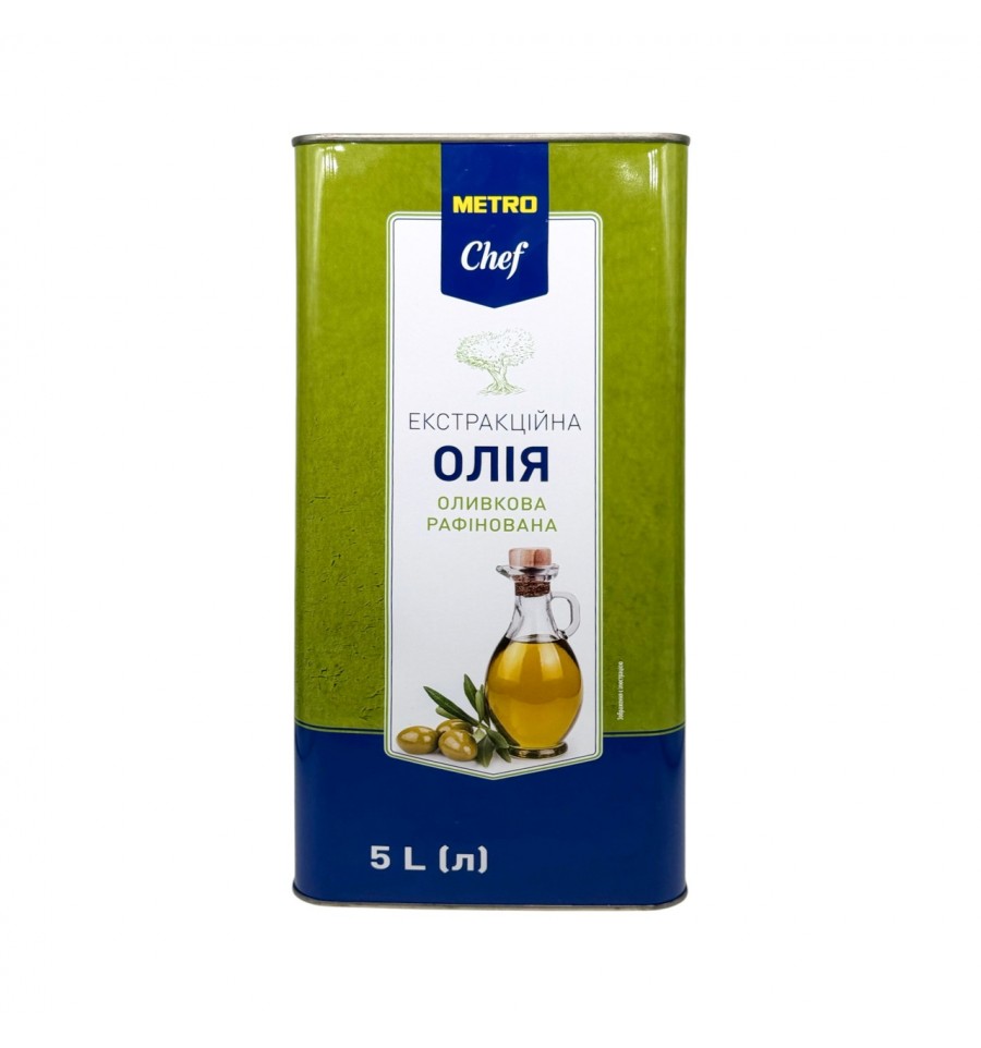 Олія оливкова рафінована екстракційна ТМ «METRO Chef». Склад: олія, одержана з оливкових вижимок методом екстракції. Поживна цінність на 100 мл продукту: енергетична цінність – 3389 кДж / 824 ккал, жири – 91,6 г, з них насичені – 13,0 г, мононенасичені – 70,0 г, поліненасичені – 8,6 г, вуглеводи – 0 г, з них цукри – 0 г, білки – 0 г, сіль – 0 г. Зберігати в сухому прохолодному місці, оберігати від прямих сонячних променів та нагрівання. При зниженні температури олія може кристалізуватися. Потримайте її деякий час за кімнатної температури і вона знову повернеться до рідкого стану, не втрачаючи своїх споживчих властивостей. Щоб відкрити кришку, підніміть зовнішнє кільце кришки, потягніть їх вгору та відкрутіть кришку (відкривання зазначено на верхній частині банки). Дата «Краще спожити до» та номер партії (L) вказані на верхній частині банки. Країна походження: Європейський Союз. Виробник: COMPAGNIA ALIMENTARE ITALIANA S.p.A., Via Ponte Tapino 19 – 03030 Броккостелла (FR), Італія. Виготовлено на замовлення / Імпортер: ТОВ «Метро Кеш енд Кері Україна», просп. П. Григоренка, 43, м. Київ, 02140, Україна. З питань щодо продукту звертайтесь за телефоном гарячої лінії імпортера: 0 800 501 401 (безкоштовно в межах України). Об’єм: 5 л.
