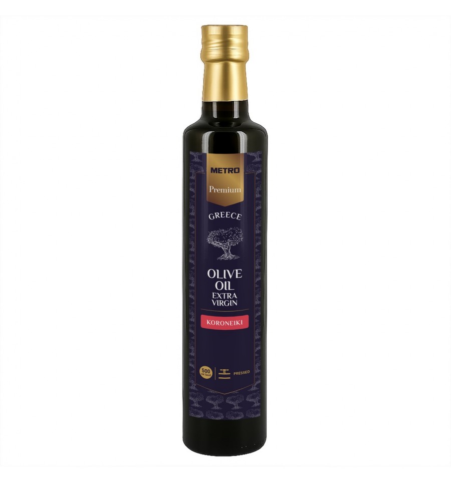 Оливкова олія екстра-класу з оливок сорту Коронейкі (Koroneiki) ТМ "METRO Premium". Оливкова олія екстра-класу отримана механічними засобами з плодів оливкового дерева. Склад: оливкова олія екстра-класу нерафінована 100%. Цей продукт виготовляється з оливок сорту Коронейкі, що вирощуються по всій Греції, переважно у регіонах Пелопоннес та Крит. Має перцевий і трохи гіркуватий смак, що є ознакою високої якості. Поживна цінність на 100 мл продукту: енергетична цінність 3389 кДж/824 ккал, жири – 91,6 г, з них насичені – 12,8 г, мононенасичені – 70,5 г, поліненасичені – 8,3 г, вуглеводи – 0 г, з них цукри – 0 г, білки – 0 г, сіль – 0 г. Зберігати за температури від 7 °C до 25 °C у сухому, захищеному від прямих сонячних променів місці, подалі від джерел тепла. Після відкриття зберігати у щільно закритій ємності в сухому прохолодному місці. При зниженні температури олія може помутніти, що не впливає на її якість. Країна походження: Греція. Виробник: NUTRIA S.A., 162 км Афіни-Ламіа Нашіонал Роад, Агіос Константінос, Фтіотида, 35006, Греція. Номер затвердження: EL 40 001. Виготовлено на замовлення/Імпортер: ТОВ "Метро Кеш енд Кері Україна", просп. П. Григоренка, 43, м. Київ, 02140, Україна. З питань щодо продукту звертатись за тел. гарячої лінії імпортера: 0 800 501 401 (безкоштовно в межах України). Об’єм: 500 мл