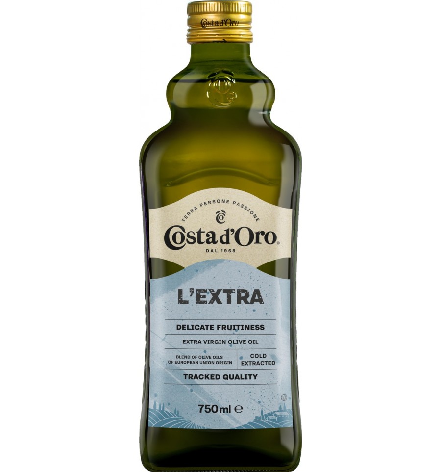 Оливкова олія екстра-вірджин. Суміш оливкових олій походженням з Європейського Союзу. Оливкова олія вищої категорії, отримана безпосередньо з оливок виключно механічним способом. Поживна цінність на 100 мл продукту: енергетична цінність 3367 кДж/819 ккал, жири – 91 г, з них насичені – 15 г, вуглеводи – 0 г, з них цукри – 0 г, білки – 0 г, сіль – 0 г, вітамін Е – 20 мг (167 % РВС). Умови зберігання: продукт зберігати в сухому прохолодному, захищеному від прямих сонячних променів місці, подалі від джерел тепла. Після відкриття продукт зберігати у щільно закритій ємності в сухому прохолодному, затемненому місці. Рекомендований діапазон температур зберігання від +12 °C до +25 °C. При температурі нижче +10 °C олія може помутніти або затвердіти, утворюючи відкладення на дні та змінюючи колір на білий, не втрачаючи своїх властивостей. При кімнатній температурі вона відновлює свій стан до рідкого та прозорого. Країна походження зазначена літерами після номера партії та ідентифікується за назвою країни: IT – Італія, ES – Іспанія, GR – Греція, PT – Португалія. Імпортер: ТОВ «Метро Кеш енд Кері Україна», 02140, Україна, м. Київ, Проспект П. Григоренка, буд. 43. З питань щодо продукту звертайтесь за тел. гарячої лінії імпортера 0800 501 401 (безкоштовно в межах України). Краще спожити до:/Номер партії: зазначено на пакуванні. Об’єм: 750 мл. Упаковано: Costa d’Oro S.p.A., Via Crispino Merini, 1 06049 Spoleto (PG), Італія