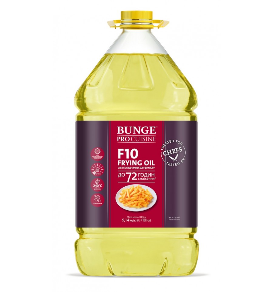 Олія соняшникова Bunge ProCuisine F10 рафінована дезодорована виморожена для фритюру 10л. Склад: олія соняшникова високоолеїнова рафінована дезодорована виморожена, піногасник Е900 - менше 0.001%. Без ГМО. Енергетична цінність продукту: 3700кДж/100г, 900ккал/100г. Поживна (харчова) цінність продукту: білки - 0г/100г, жири - 99.9г/100г, насичені жири - 9г/100г, вуглеводи - 0г/100г, з них цукри - 0г/100г, сіль - 0г/100г. Умови зберігання: зберігати за температури 0..+30ºC. Зберігати в закритому, затемненому приміщенні. Термін придатності: 24 місяці. Температура зберігання після відкриття продукту: зберігати за температури 0..+11ºC. Термін придатності після відкриття продукту: 100 днів. Країна виробник: Україна. Виробничі потужності та адреса виробничих потужностей: ПрАТ з ІІ Дніпропетровський олійноекстракційний завод, вул. Князя Ярослава Мудрого, 46, м. Дніпро, Україна, 49000. Оператор ринку та адреса оператора ринку: ПрАТ з ІІ Дніпропетровський олійноекстракційний завод, вул. Князя Ярослава Мудрого, 46, м. Дніпро, Україна, 49000. Маса нетто: 9.14кг. Об`єм: 10л.