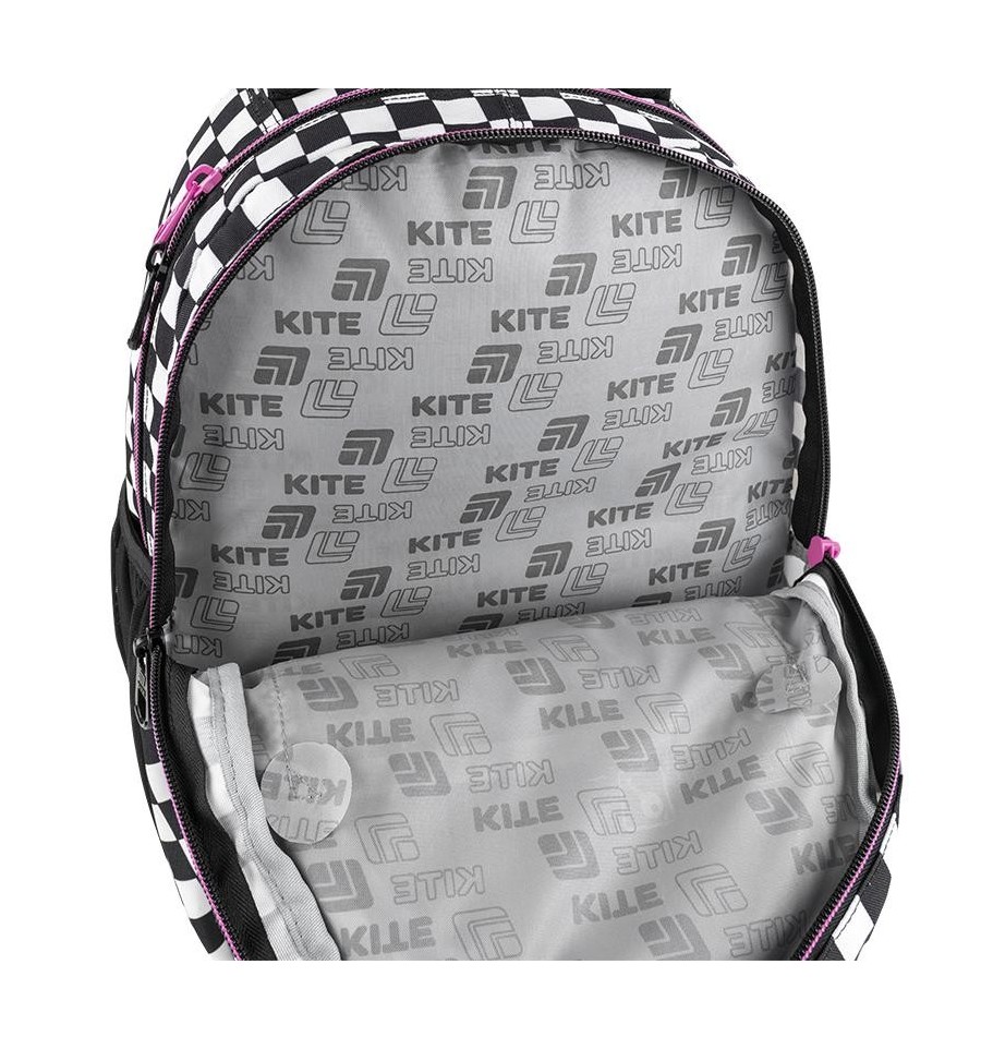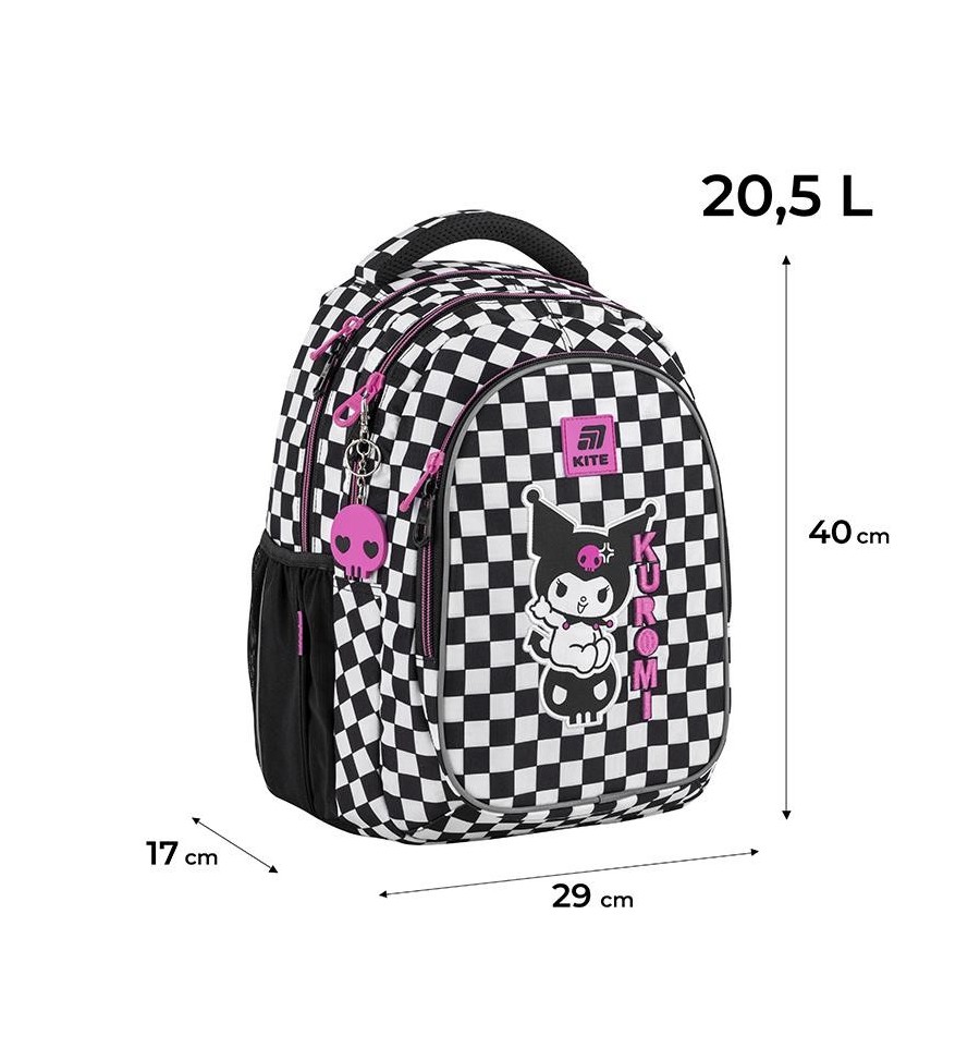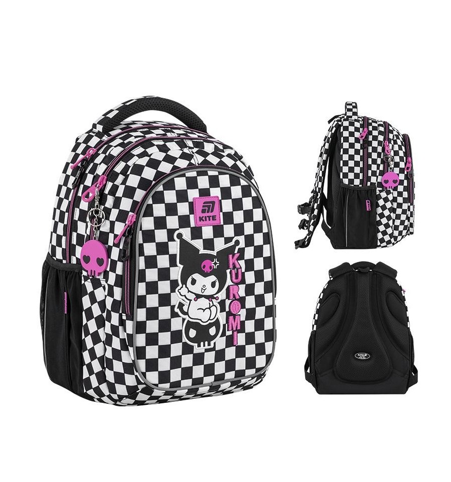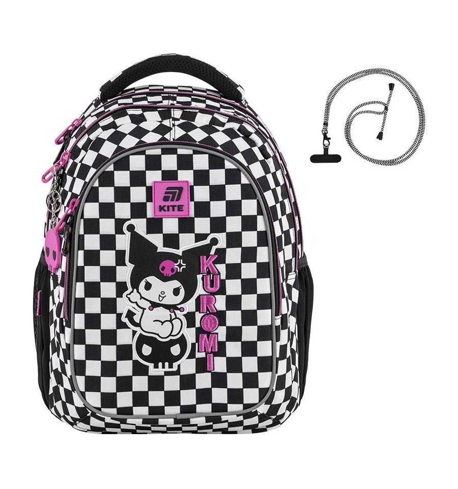 Рюкзак Kite HK25-8001M – рюкзак незамінний для школи, екскурсій, поїздок, прогулянок та дозвілля. Завдяки безлічі зручних відділень та кишеньок, кожна річ буде на своєму місці. Ортопедична конструкція подбає про комфорт та здоров'я спини. Продумана організація внутрішнього простору, приголомшлива місткість та трендовий дизайн. Втілення комфорту та бездоганної європейської якості.Модель рекомендована для підлітків від 9-12 років, зростом від 130 см. Подарунок до рюкзака – модний шнурок для телефону.Ефектний дизайн в трендовій ліцензії Kuromi – щоб бути наймоднішою в усій школі. Ходити в школу разом з улюбленими персонажами та транслювати свої уподобання – те, що так люблять школярі!Бренд Kite — визнаний лідер у світі рюкзаків, який щороку отримує найпрестижніші нагороди: Вибір року, Вибір країни, Українська народна премія. Споживачі та експерти ринку обирають Kite за бездоганну якість, стиль, інноваційні рішення та ергономічний дизайн.Рюкзак зовні: запатентована ортопедична спинка Ergo Teens з м'якими дихаючими подушечками – розроблена спеціально для підлітків середнього і старшого шкільного віку. Повторює природні вигини хребта, щільно прилягає і знижує навантаження на спину; широкі вентильовані лямки S-подібної форми м'яко лягають на плечі, не тиснуть і не натирають; знімний нагрудний ремінь фіксує лямки в зручному положенні, бере участь в правильному рівномірному розподілі ваги; велика передня кишеня, всередині якої розташований органайзер для канцелярських дрібниць, знімна ключниця і кишеня для телефону з плюшем, який захищає екран; 2 бічні кишені з сіточкою на резинці, в яких зручно розміщувати пляшечку з водою або невеликий термос; м'яка ущільнена ручка-переноска з EVA всередині; текстильна петля для підвішування рюкзака на гачок; посилене дно для практичності та стійкості; високоякісна фурнітура – надійні блискавки з масивними пуллерами працюють плавно; світловідбивні елементи – щоб дитина була помітною на дорозі в темну пору доби; декор: об'ємна вишивка, нашивка, гумовий брелок-підвіска з металевим карабіном. Рюкзак всередині: 2 просторих основних відділення; зручні роздільники для книг та зошитів; кишеня для планшета з плюшем для захисту екрану; міцна брендована підкладка; іконки внутрішньої навігації, які підказують призначення кожної кишеньки. Матеріали і фурнітура пройшли випробування на міцність і стійкість до зношування. Тканина не вигорає та довго зберігає первинний вигляд. Блискавки – якісні та надійні, працюють плавно.