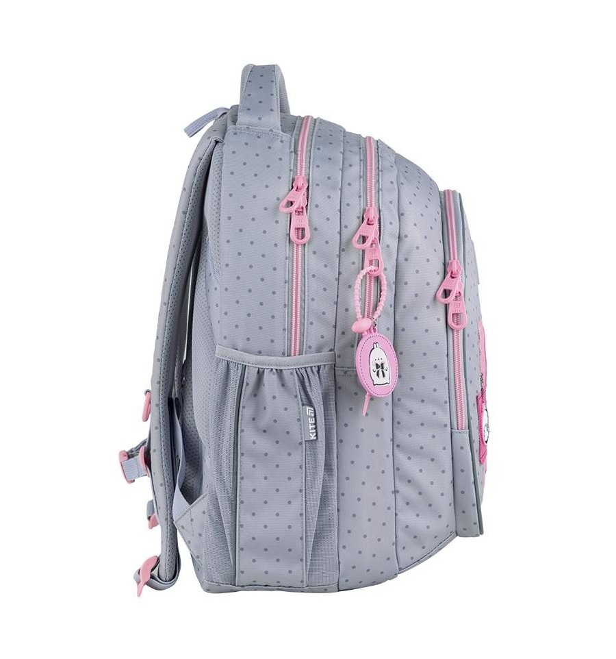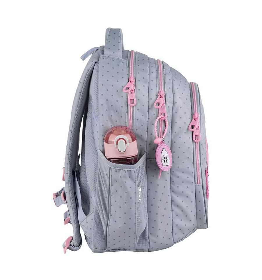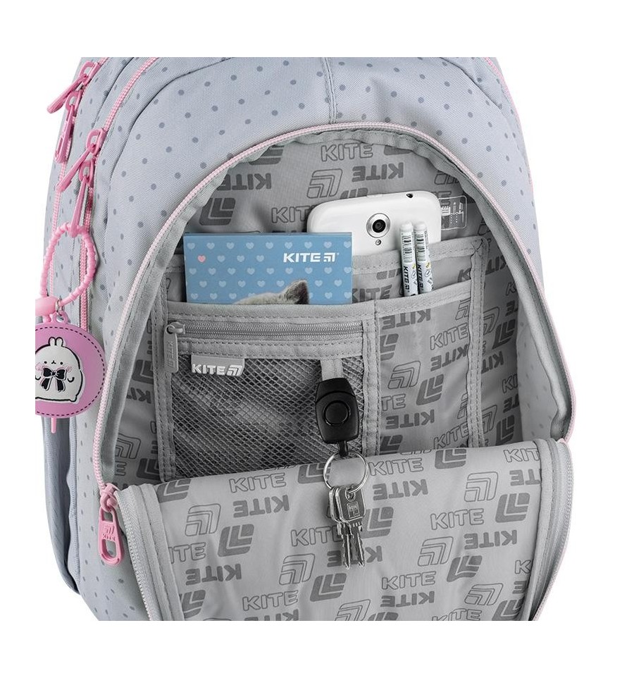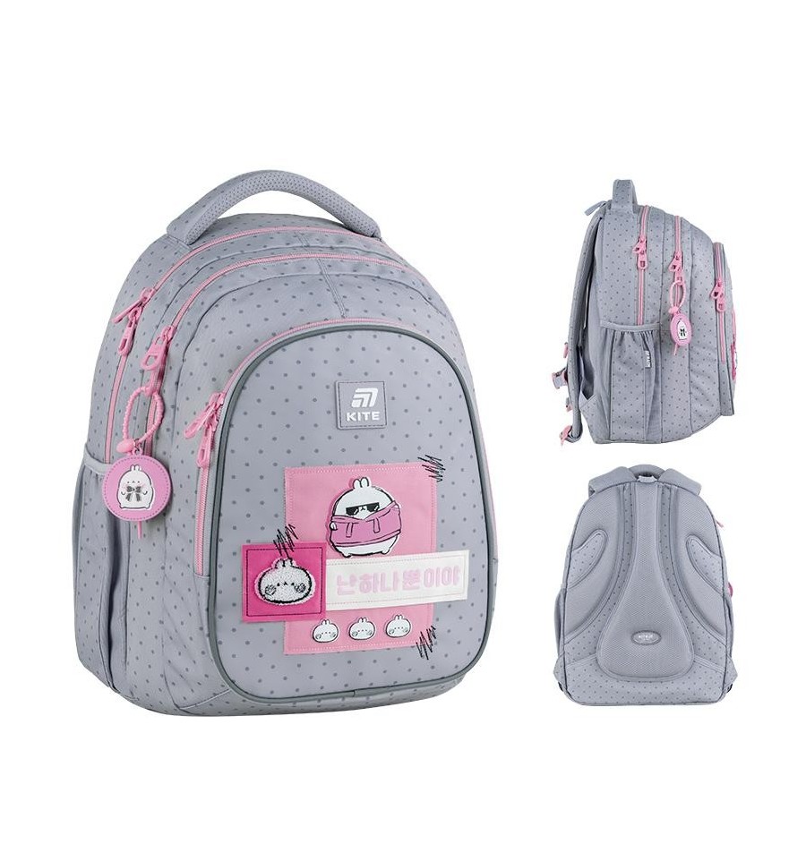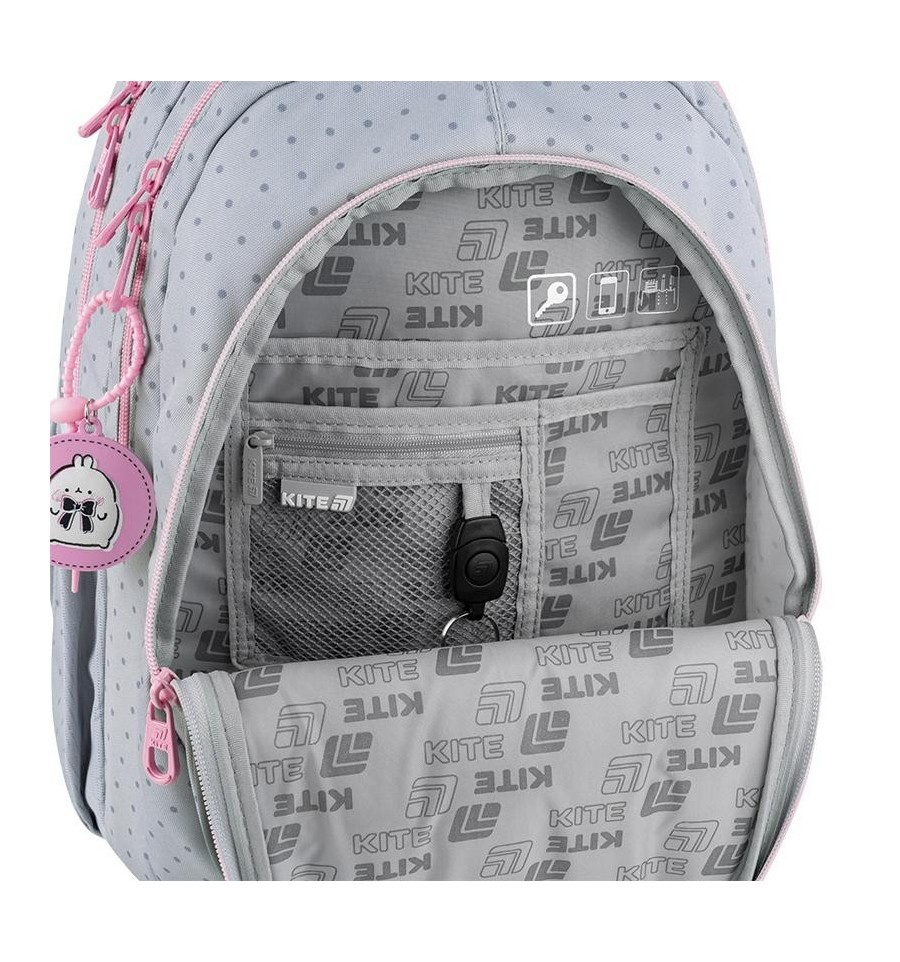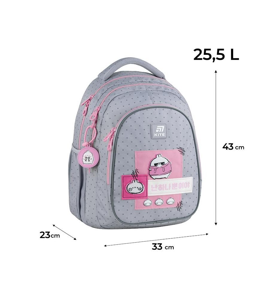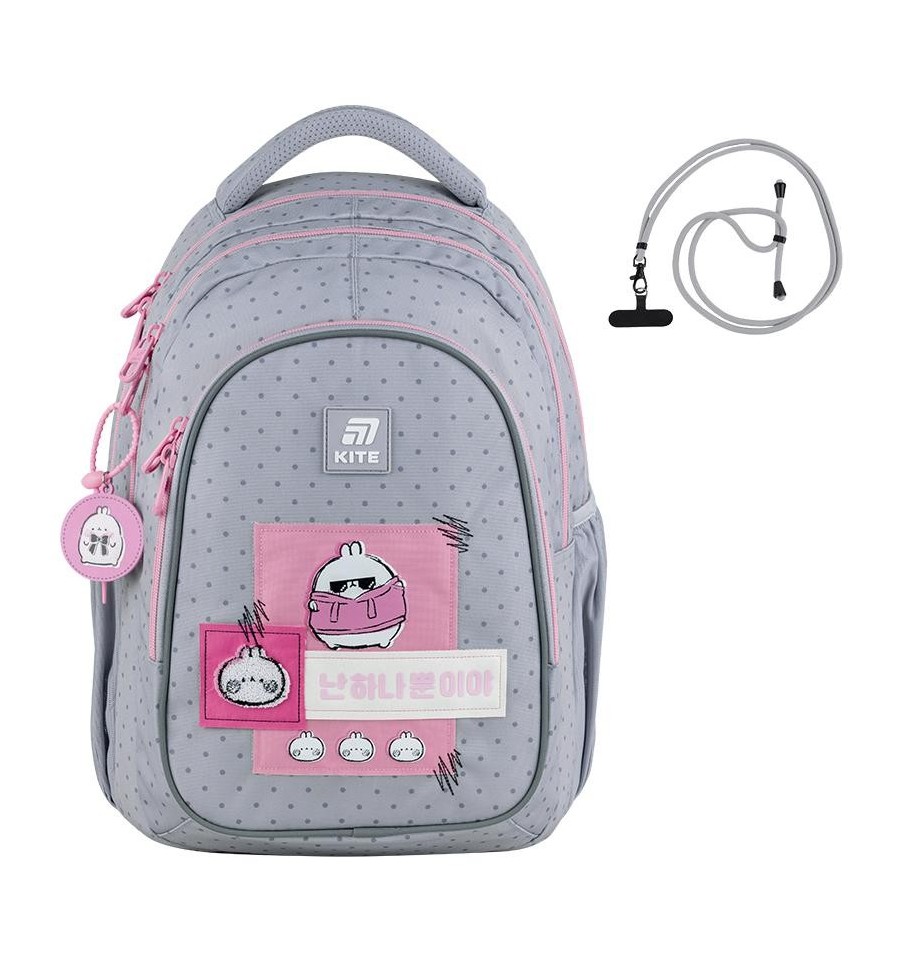 Рюкзак Kite ML25-8001L – рюкзак незамінний для школи та університету, екскурсій та поїздок, прогулянок та дозвілля. Завдяки безлічі зручних відділень та кишеньок, кожна річ буде на своєму місці. Ортопедична конструкція подбає про комфорт та здоров'я спини.Продумана організація внутрішнього простору, приголомшлива місткість та трендовий дизайн. Втілення комфорту та бездоганної європейської якості.Модель рекомендована для підлітків від 12 років та дорослих, зростом від 145 см.Подарунок до рюкзака – модний шнурок для телефону.Ніжний і милий дизайн в ліцензії Molang – ідеальний вибір для тих, хто обожнює затишок і позитивні емоції.Бренд Kite — визнаний лідер у світі рюкзаків, який щороку отримує найпрестижніші нагороди: Вибір року, Вибір країни, Українська народна премія. Споживачі та експерти ринку обирають Kite за бездоганну якість, стиль, інноваційні рішення та ергономічний дизайн.Рюкзак зовні: запатентована ортопедична спинка Ergo Teens з м'якими дихаючими подушечками – розроблена спеціально для підлітків середнього і старшого шкільного віку. Повторює природні вигини хребта, щільно прилягає і знижує навантаження на спину; широкі вентильовані лямки S-подібної форми м'яко лягають на плечі, не тиснуть і не натирають; знімний нагрудний ремінь фіксує лямки в зручному положенні, бере участь в правильному рівномірному розподілі ваги; велика передня кишеня, всередині якої розташований органайзер для канцелярських дрібниць, знімна ключниця і кишеня для телефону з плюшем, який захищає екран; 2 бокові кишені з сіточкою на гумці, в яких зручно розміщувати пляшечку з водою або невеликий термос; м'яка ущільнена ручка-переноска з EVA всередині; текстильна петля для підвішування рюкзака на гачок; посилене дно для практичності та стійкості; високоякісна фурнітура – надійні блискавки з масивними пуллерами працюють плавно; світловідбивні елементи – щоб дитина була помітною на дорозі в темну пору доби; декор: аплікація з комбінованих матеріалів, гумовий брелок-підвіска. Рюкзак всередині: 2 просторих основних відділення; кишеня для ноутбука; кишеня для планшета з плюшем для захисту екрану; міцна та надійна підкладка; іконки внутрішньої навігації, підказують призначення кожної кишеньки. Матеріали і фурнітура пройшли випробування на міцність і стійкість до зношування. Тканина не вигорає та довго зберігає первинний вигляд. Блискавки – якісні та надійні, працюють плавно.