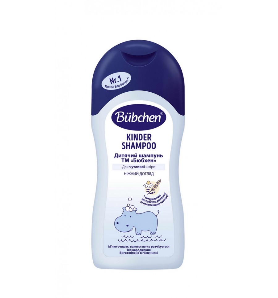 Дитячий шампунь, 200 мл. Особливо ніжно очищає волосся, не подразнює шкіру голови і захищає від пересихання. Волосся стає шовковистим і легко розчісується. Містить комплекс «Бюбхен-активний захист шкіри» і натуральні активні компоненти ромашки і протеїнів пшениці. Використовувати з народження. Флакон 200 мл. Склад: вода, двунатрієвий лаурет сульфокцинат, лаурет-3, гліцерин, PEG-120 метил глюкоза діолеат, натрій С14-16 сульфірований олефір, кокамідопропіл бетаїну, хлорид натрію, екстракт ромашки, лимонна кислота, гідролізованій білок пшениці, парфумерна композиці, феноксиетанол, полісорбат 20, бензоат натрію, токоферол. Умови зберігання: зберігати при температурі +4°С до +25° С. Термін придатності: 940 днів від дати виробництва. Виробничі потужності: Bubchen Werk Ewald Hermes Pharmazeutische Fabrik GmbH. Власник бренду: Katjes Gruppe. Країна Німеччина. Адреса виробничих потужностей: Коестервег, 37, Зост, Німеччина, 59494. Переваги: без барвників, без консервантів, не містить мінерального масла, pH-нейтральний, перевірено дерматологами, не містить мила, миючі речовини на рослинній основі, не подразнює очі. Застосування: кілька крапель шампуню видавити на руку, розподілити між долонями і нанести на вологе волосся, легко помасажувати кінчиками пальців до отримання легкої піни і обполоснути чистою теплою водою. Підходить для щоденного використання. Для немовлят (з народження) і для всієї родини.