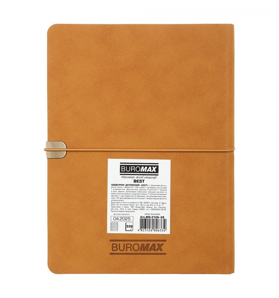 Щоденник BUROMAX - це завжди широкий вибір різноманітних обкладинок, текстур, розмірів та кольорів. Ми знайдемо підхід до серця кожного покупця!Гнучка обкладинка щоденника BEST виконана з штучної шкіри з оксамитовою фактурою типу soft-touch. Унікальною особливістю моделі є оригінальне декоративне тиснення року, виконане по всій лицьовій стороні обкладинки. Поперечна гумка надійно фіксує щоденник у закритому стані та допоможе зберегти всі важливі записи та плани. Дизайн гармонійно доповнює тонування зрізу внутрішнього блоку в колір обкладинки та металеві шильди-накладки із заглибленнями на лицьовій та задній частинах обкладинки, на яких оригінально та фіксовано лягає гумка.Формат А5 336 сторінок Внутрішній блок: офсетний папір кремового кольору щільністю 70 г/м² Закладка-лясе в колір обкладинки Перфоровані куточки аркушів Друк блоку в 2 кольори: сірий і бордовий Дві мови блоку: українська, англійська Мапи України та Європи на форзацах Індивідуальна упаковка: картонна коробка Структура внутрішнього блоку:Сторінка для внесення особистої інформації Календарі на 2025 - 2028 роки Планінг на 2026 рік Інформаційно-довідковий блок: національні, релігійні, професійні свята та пам'ятні дати, знаки зодіаку, телефонні коди мобільних операторів та обласних центрів України, літерні автомобільні коди країн, таблиця відстаней між обласними центрами України, довідник систем вимірювання, міжнародні знаки відповідності, знаки догляду за одягом Датована сторінка на кожен день року з організатором часу від 7:00 до 21:00, календарем на поточний/наступний місяць, позначенням дня тижня, знаку зодіаку, іменинників Алфавітна книга для внесення контактів Щоденник BUROMAX формату А5 - це вибір, перевірений часом, найпопулярніший формат для незамінного помічника в плануванні Вашого робочого дня!
