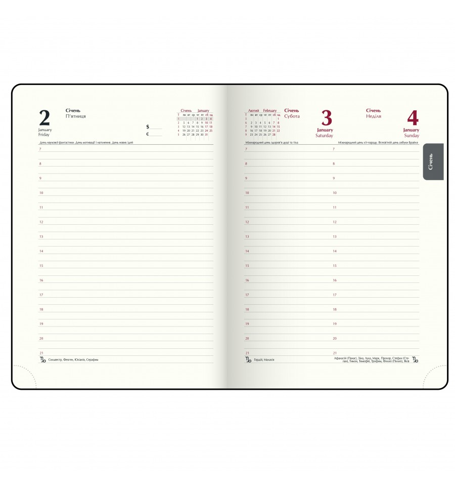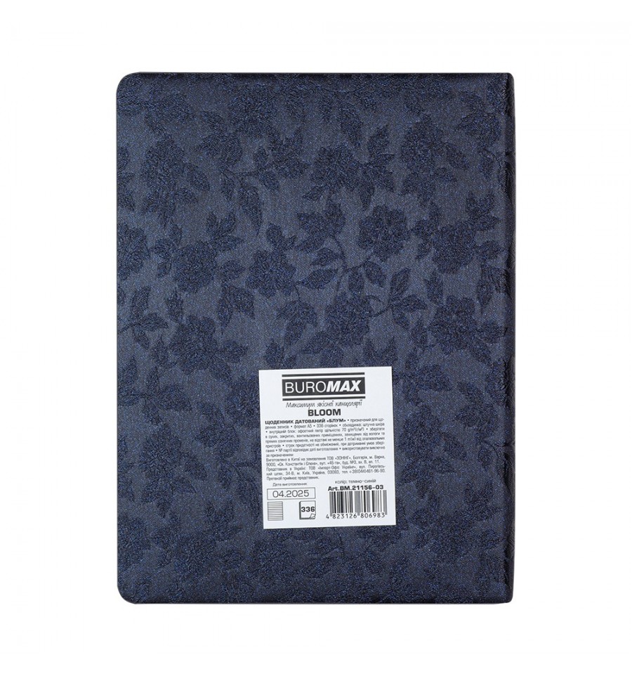 Щоденники BUROMAX - це завжди широкий вибір самих різних обкладинок, фактур, розмірів і кольорів. Ми знайдемо підхід до серця кожного покупця!Гнучка обкладинка зі штучної шкіри щоденника BLOOM має стильний та привабливий квітковий дизайнерський візерунок та фактурну поверхню, що виблискує на світлі. Гармонійно доповнює дизайн тонований в чорний колір зріз внутрішнього блоку та нанесення року на ньому.Формат А5 336 сторінок Внутрішній блок: офсетний папір кремового кольору щільністю 70 г/м² Закладка-лясе в колір обкладинки Перфоровані куточки аркушів Друк блоку в 2 кольори: сірий і бордовий Дві мови блоку: українська, англійська Форзаци в колір обкладинки Індивідуальна упаковка: картонна коробка Структура внутрішнього блоку:Сторінка для внесення особистої інформації Календарі на 2025 - 2028 роки Планінг на 2026 рік Інформаційно-довідковий блок: національні, релігійні, професійні свята та пам'ятні дати, знаки зодіаку, телефонні коди мобільних операторів та обласних центрів України, літерні автомобільні коди країн, таблиця відстаней між обласними центрами України, довідник систем вимірювання, міжнародні знаки відповідності, знаки догляду за одягом Датована сторінка на кожен день року з організатором часу від 7:00 до 21:00, календарем на поточний/наступний місяць, позначенням дня тижня, знаку зодіаку, іменинників Алфавітна книга для внесення контактів Щоденник BUROMAX формату А5 - це вибір, перевірений часом, найпопулярніший формат для незамінного помічника в плануванні Вашого робочого дня!