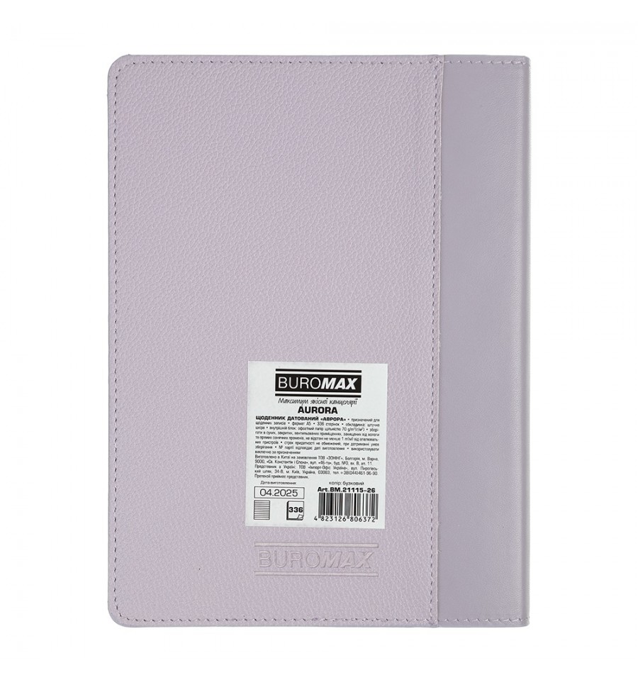 Щоденники BUROMAX - це завжди широкий вибір самих різних обкладинок, фактур, розмірів і кольорів. Ми знайдемо підхід до серця кожного покупця!Гнучка знімна обкладинка-органайзер з штучної шкіри щоденника AURORA виконана в ніжному пастельному дизайні, що поєднує матеріал з фактурної шкіри та вставку на корінці з гладкої шкіри. Елементи оздоблення - сліпе тиснення року та декоративний шов по периметру і на стику фактур. Родзинкою дизайну є тонування сріблом зрізу внутрішнього блоку. З середини обкладинка має по кишені для візиток, нотаток тощо на передній та задній стороні, а також петельку для закріплення письмового приладдя.Формат А5 336 сторінок Внутрішній блок: офсетний папір кремового кольору щільністю 70 г/м² Закладка-лясе в колір обкладинки Перфоровані куточки аркушів Друк блоку в 2 кольори: сірий і бордовий Дві мови блоку: українська, англійська Мапи України та Європи на форзацах Індивідуальна упаковка: картонна коробка Структура внутрішнього блоку:Сторінка для внесення особистої інформації Календарі на 2025 - 2028 роки Планінг на 2026 рік Інформаційно-довідковий блок: національні, релігійні, професійні свята та пам'ятні дати, знаки зодіаку, телефонні коди мобільних операторів та обласних центрів України, літерні автомобільні коди країн, таблиця відстаней між обласними центрами України, довідник систем вимірювання, міжнародні знаки відповідності, знаки догляду за одягом Датована сторінка на кожен день року з організатором часу від 7:00 до 21:00, календарем на поточний/наступний місяць, позначенням дня тижня, знаку зодіаку, іменинників Алфавітна книга для внесення контактів Щоденник BUROMAX формату А5 - це вибір, перевірений часом, найпопулярніший формат для незамінного помічника в плануванні Вашого робочого дня!