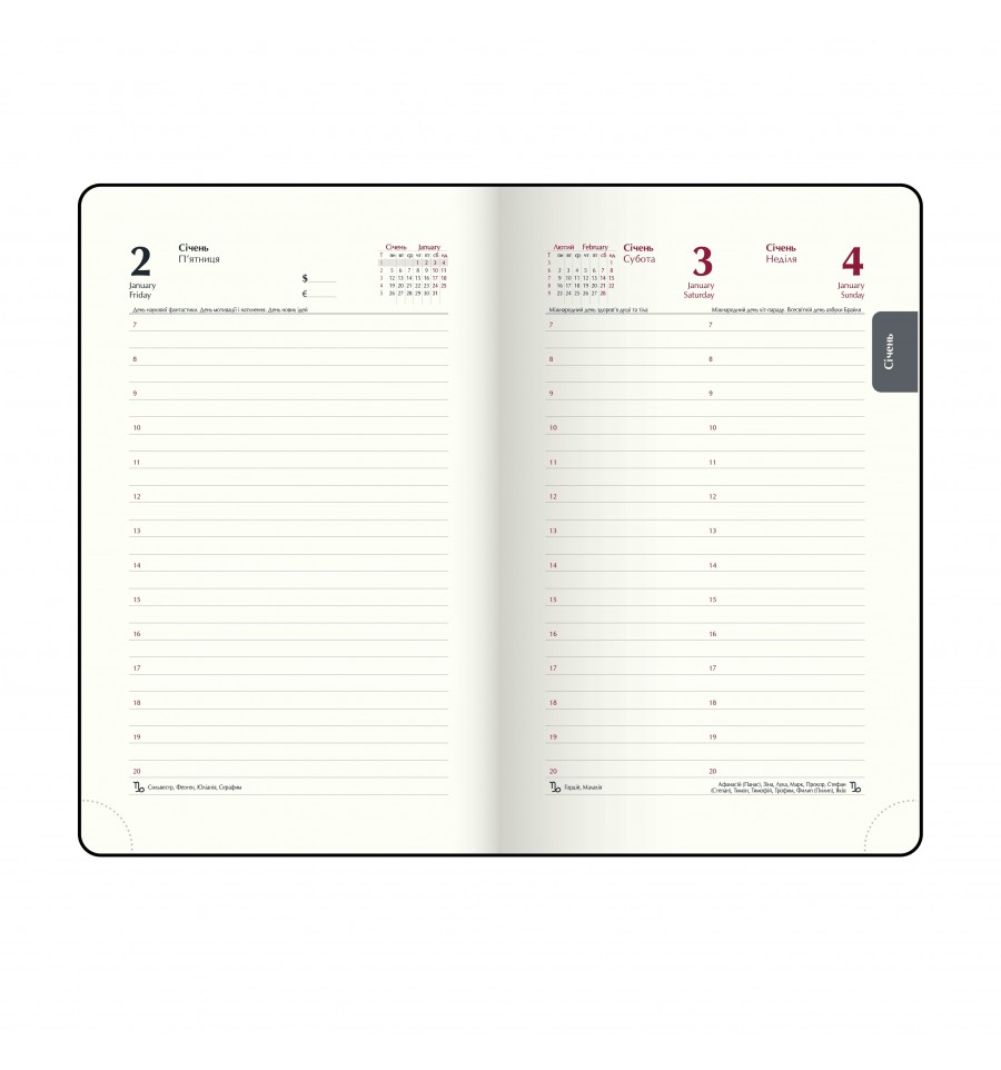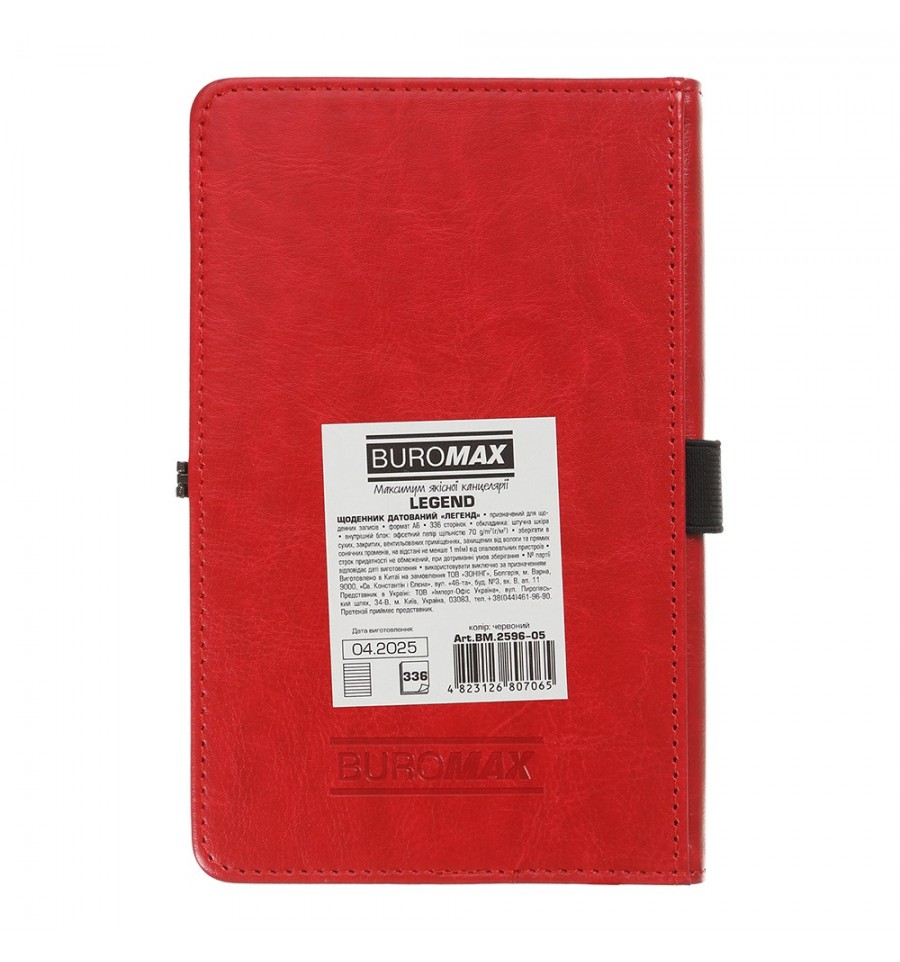 Щоденники BUROMAX - це завжди широкий вибір самих різних обкладинок, фактур, розмірів і кольорів. Ми знайдемо підхід до серця кожного покупця!Жорстка обкладинка зі штучної шкіри щоденника LEGEND має сліпе тиснення року на лицьовій стороні та елегантну металеву магнітну застібку, яка зафіксує щоденник у закритому положенні. По-периметру обкладинка оброблена декоративним швом. Гармонійно відтіняє тонований у чорний колір зріз внутрішнього блоку.Формат А6 336 сторінок Внутрішній блок: офсетний папір кремового кольору щільністю 70 г/м² Закладка-лясе в колір обкладинки Перфоровані куточки аркушів Друк блоку в 2 кольори: сірий і бордовий Дві мови блоку: українська, англійська Форзаци в колір обкладинки Індивідуальна упаковка: картонна коробка Структура внутрішнього блоку:Сторінка для внесення особистої інформації Календарі на 2025 - 2028 роки Планінг на 2026 рік Інформаційно-довідковий блок: національні, релігійні, професійні свята та пам'ятні дати, знаки зодіаку, телефонні коди мобільних операторів та обласних центрів України, літерні автомобільні коди країн, таблиця відстаней між обласними центрами України, довідник систем вимірювання, міжнародні знаки відповідності, знаки догляду за одягом Датована сторінка на кожен день року з організатором часу від 7:00 до 21:00, календарем на поточний/наступний місяць, позначенням дня тижня, знаку зодіаку, іменинників Алфавітна книга для внесення контактів Щоденник BUROMAX - це вибір, перевірений часом, незамінний помічник в плануванні Вашого робочого дня!На цій моделі щоденника можливе тиснення як сліпим методом так і методом фольгування.