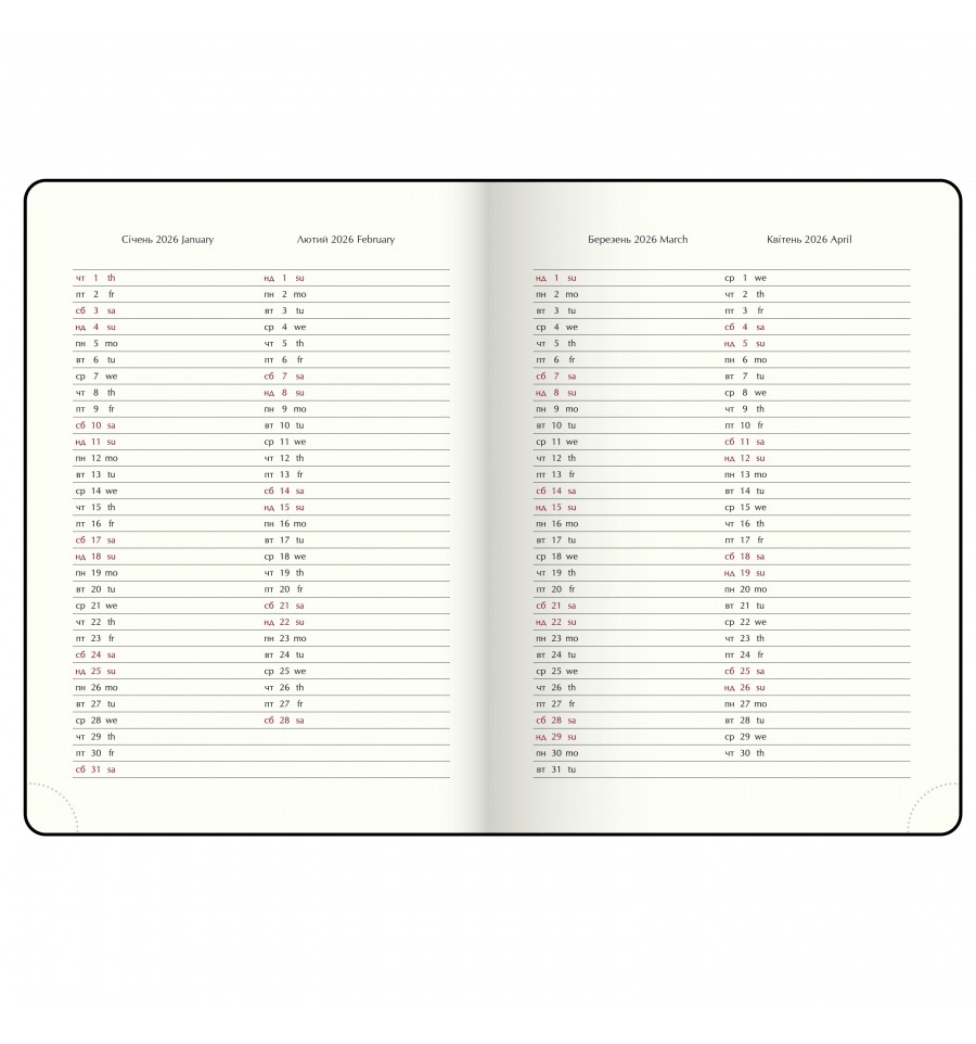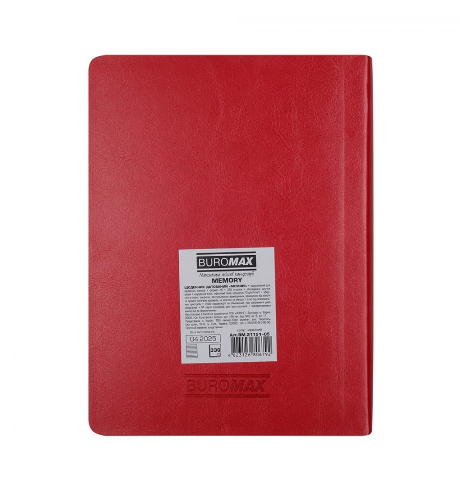 Щоденники BUROMAX - це завжди широкий вибір самих різних обкладинок, фактур, розмірів і кольорів. Ми знайдемо підхід до серця кожного покупця!Гнучка обкладинка з гладкої штучної шкіри щоденника MEMORY має 3D напис на лицьовій стороні, зроблений контрастним золотим кольором. Гармонійно доповнює дизайн тонований в колір обкладинки зріз внутрішнього блоку.Формат А5 336 сторінок Внутрішній блок: офсетний папір кремового кольору щільністю 70 г/м² Закладка-лясе в колір обкладинки Перфоровані куточки аркушів Друк блоку в 2 кольори: сірий і бордовий Дві мови блоку: українська, англійська Мапи України та Європи на форзацах Індивідуальна упаковка: картонна коробка Структура внутрішнього блоку:Сторінка для внесення особистої інформації Календарі на 2025 - 2028 роки Планінг на 2026 рік Інформаційно-довідковий блок: національні, релігійні, професійні свята та пам'ятні дати, знаки зодіаку, телефонні коди мобільних операторів та обласних центрів України, літерні автомобільні коди країн, таблиця відстаней між обласними центрами України, довідник систем вимірювання, міжнародні знаки відповідності, знаки догляду за одягом Датована сторінка на кожен день року з організатором часу від 7:00 до 21:00, календарем на поточний/наступний місяць, позначенням дня тижня, знаку зодіаку, іменинників Алфавітна книга для внесення контактів