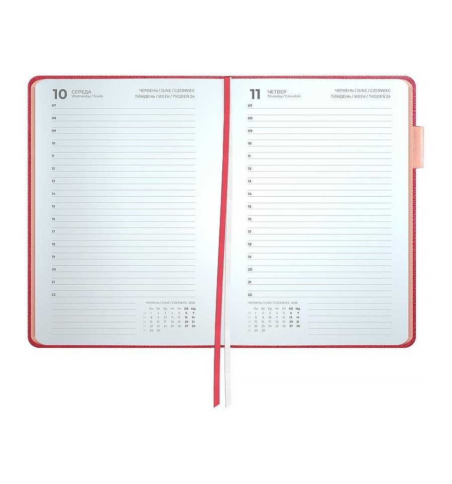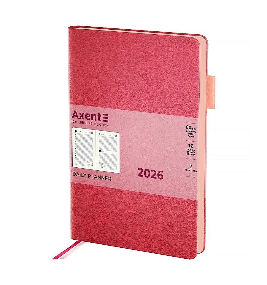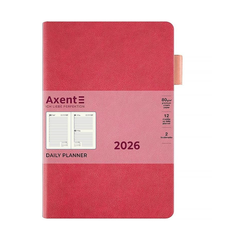 Зручний щоденник Axent із серії Partner Muse в м'якій обкладинці із кольоровим зрізом. Використовується для щоденних записів, а також ділових та творчих задач.М`яка обкладинка допомагає зберегти акуратний та презентабельний вигляд протягом довгого часу. Якісний кремовий папір щільністю 80 г/м2 добре вбирає чорнило та забезпечує комфортне письмо.Зручно робити записи, креслити та малювати. Щоденник має датований блок у лінію на кожний день.Внутрішній блок українською мовою. Щоденник містить календар на 2026-2027 рік, загальний тижневий розклад, інформацію про свята, важливі номери телефонів, часові пояси країн світу, одиниці вимірювання, шкалу температур.Дві різнокольорові закладки-ляссе дозволяють швидко знайти та відкрити потрібні сторінки. Містить 168 аркушів, розмір - 145*210 мм. Кишені на форзаці немає. Немає тасьми на обкладинці. Є петля для ручки.