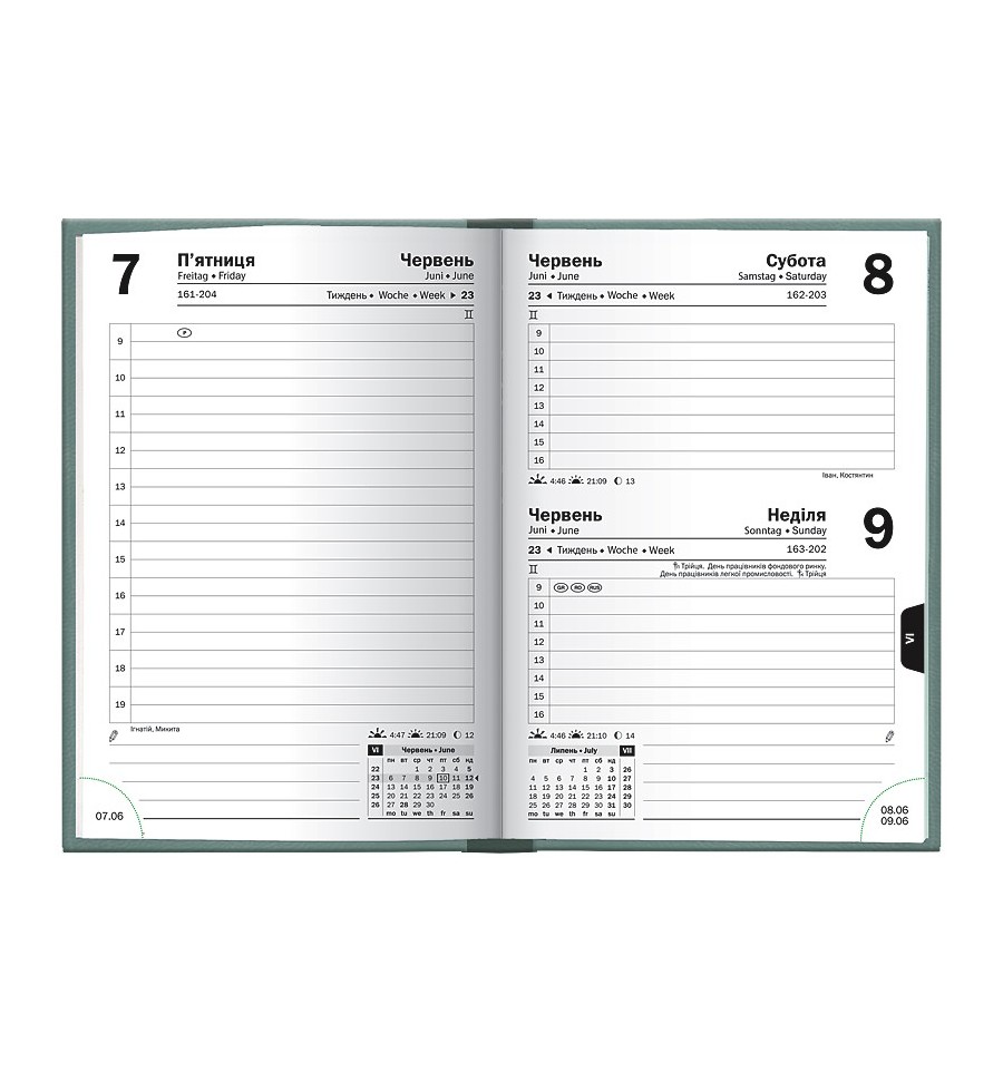 Щоденник датований кишеньковий Brunnen 2026 – компактна модель для активних особистостей. Гармонійне поєднання консервативного внутрішнього блоку та стильної обкладинки. Особливості: Компактний формат А6. Три мови: українська, англійська, німецька. Кремові форзаци. 1 сторінка – 1 день. Субота та неділя на одній сторінці. Організатор з 09:00 до 19:00. Інформаційний блок. Перфоровані датовані куточки. Якісний друк у сірому кольорі. Сторінки загального планування на місяць. Календарі на 2026 і 2027 рр. Білий папір 70 г/м². Відривні сторінки з перфорацією для записів. Обкладинка Torino Trend. Біле тиснення.