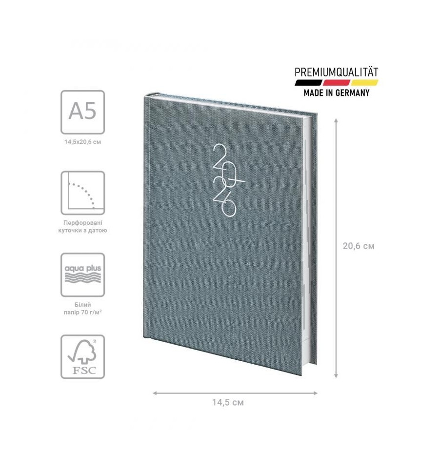 Датований щоденник BRUNNEN 2026 Стандарт — стильна класична модель. Оптимізований простір для записів та зручна навігація. Особливості: Три мови: українська, англійська, німецька. Загальна кількість сторінок — 336. Одна сторінка — один день. Організатор часу з 07:00 до 22:00. Якісний друк у сірому кольорі. 4 сторінки для загального планування на рік. Розширений інформаційний блок. Білий європейський папір 70 г/м2. Закладка-лясе та відривні куточки з датою. Стильна обкладинка Linesse. Золоте тиснення.