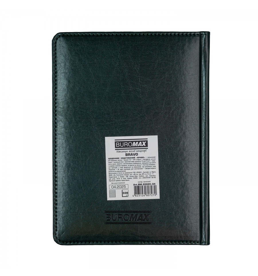 Щоденники BUROMAX - це завжди широкий вибір самих різних обкладинок, фактур і кольорів. Ми знайдемо підхід до серця кожного покупця!Жорстка обкладинка щоденника BRAVO виготовлена під натуральну шкіру. Класичний та стриманий дизайн стане відмінним доповненням корпоративного стилю компанії. Декоративний шов по периметру доповнює дизайн.Недатований щоденник зберіг переваги датованого щоденника, але разом з тим, не залежить від дат, що дозволяє вести записи без хронології та в довільному порядку.Формат А5 336 сторінок Тверда обкладинка з штучної шкіри з поролоном Внутрішній блок: офсетний папір кремового кольору щільністю 70 г/м² Закладка-лясе в колір обкладинки допоможе швидко знайти необхідну сторінку Перфоровані куточки аркушів Мапи України та Європи на форзацах Індивідуальна упаковка: картонна коробкаСтруктура внутрішнього блоку: Сторінка для внесення особистої інформації Планінг на рік Інформаційно-довідковий блок: телефонні коди мобільних операторів та обласних центрів України, літерні автомобільні коди країн, таблиця відстаней між обласними центрами України, довідник систем вимірювання, міжнародні знаки відповідності, знаки догляду за одягом Недатовані сторінки з лініюванням у лінію, мають рядок для напису дати Алфавітна книга для внесення контактів Щоденник BUROMAX формату А5 - це вибір, перевірений часом, найпопулярніший формат для незамінного помічника в плануванні Вашого робочого дня!На цій моделі щоденника можливо тиснення як сліпим методом, так і методом фольгування.