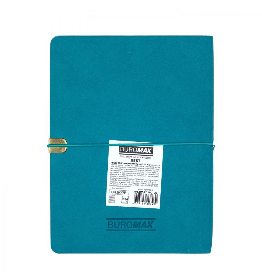 Щоденники BUROMAX – це завжди широкий вибір різних обкладинок, фактур і кольорів. Ми знайдемо підхід до серця кожного покупця!Гнучка обкладинка щоденника BEST виконана зі штучної шкіри з оксамитовою фактурою типу soft-touch. Поперечна кругла гумка акуратно лягає на металеві шильди на краю обкладинки та надійно фіксує щоденник у закритому положенні. Дизайн гармонійно доповнює тонування зрізу внутрішнього блоку кольором обкладинки.Недатований щоденник зберіг переваги датованого, але не залежить від дат і дозволяє вести записи без хронології в довільному порядку.Формат А5 336 сторінок Гнучка обкладинка зі штучної шкіри Внутрішній блок: офсетний папір кремового кольору щільністю 70 г/м² Закладка-лісі у колір обкладинки допоможе швидко знайти необхідну сторінку Перфоровані куточки листів Карти України та Європи на форзацах Індивідуальна упаковка: картонна коробка Структура внутрішнього блокуСторінка для внесення особистої інформації Планінг на рік Інформаційно-довідковий блок: телефонні коди мобільних операторів та обласних центрів України, літерні автомобільні коди країн, таблиця відстаней між обласними центрами України, довідник систем вимірювання, міжнародні знаки відповідності, знаки догляду за одягом Недатовані сторінки в лінію мають рядок для напису дати Алфавітна книга для внесення контактів Щоденник BUROMAX А5 формату – це вибір, перевірений часом, найпопулярніший формат для незамінного помічника у плануванні Вашого робочого дня.На цій моделі щоденника можливе тиснення як сліпим методом, так і методом фольгування.
