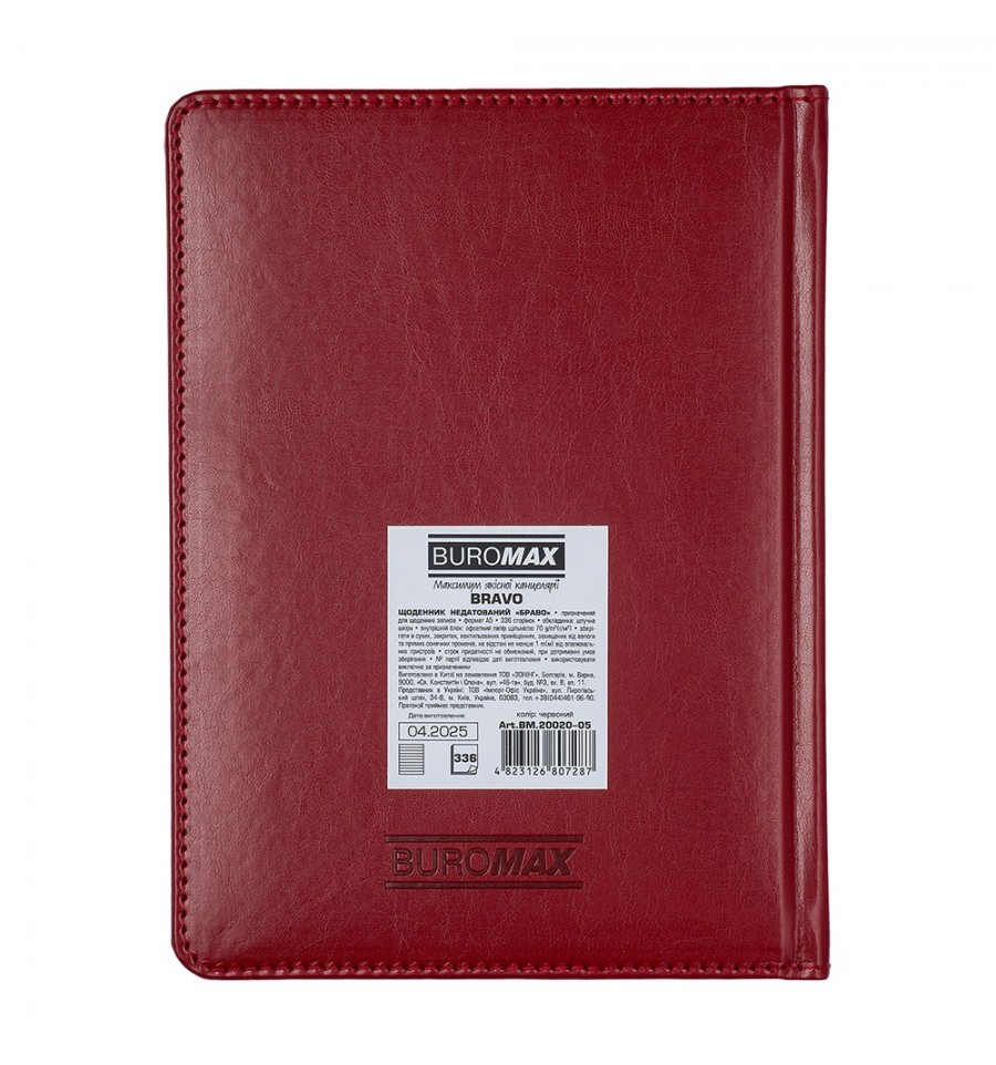 Щоденники BUROMAX - це завжди широкий вибір самих різних обкладинок, фактур і кольорів. Ми знайдемо підхід до серця кожного покупця!Жорстка обкладинка щоденника BRAVO виготовлена під натуральну шкіру. Класичний та стриманий дизайн стане відмінним доповненням корпоративного стилю компанії. Декоративний шов по периметру доповнює дизайн.Недатований щоденник зберіг переваги датованого щоденника, але разом з тим, не залежить від дат, що дозволяє вести записи без хронології та в довільному порядку.Формат А5 336 сторінок Тверда обкладинка з штучної шкіри з поролоном Внутрішній блок: офсетний папір кремового кольору щільністю 70 г/м² Закладка-лясе в колір обкладинки допоможе швидко знайти необхідну сторінку Перфоровані куточки аркушів Мапи України та Європи на форзацах Індивідуальна упаковка: картонна коробкаСтруктура внутрішнього блоку: Сторінка для внесення особистої інформації Планінг на рік Інформаційно-довідковий блок: телефонні коди мобільних операторів та обласних центрів України, літерні автомобільні коди країн, таблиця відстаней між обласними центрами України, довідник систем вимірювання, міжнародні знаки відповідності, знаки догляду за одягом Недатовані сторінки з лініюванням у лінію, мають рядок для напису дати Алфавітна книга для внесення контактів Щоденник BUROMAX формату А5 - це вибір, перевірений часом, найпопулярніший формат для незамінного помічника в плануванні Вашого робочого дня!На цій моделі щоденника можливо тиснення як сліпим методом, так і методом фольгування.
