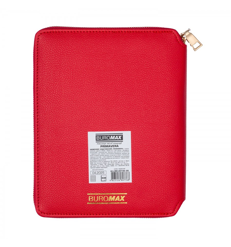 Щоденники BUROMAX - це завжди широкий вибір самих різних обкладинок, фактур і кольорів. Ми знайдемо підхід до серця кожного покупця!Знімна обкладинка зі штучної шкіри щоденника PRIMAVERA виконана у вигляді клатчу, який закривається на золотисту блискавку, що надійно фіксує щоденник в закритому стані. На внутрішній стороні обкладинки розміщені завіс для ручки, а також клапан-кишеня, на якому розташовані 3 відділення для візиток, карток та дрібних записів. Внутрішня сторона обкладинки та зріз внутрішнього блоку гармонійно виконані в золотому кольорі.Недатований щоденник зберіг переваги датованого щоденника, але разом з тим, не залежить від дат, що дозволяє вести записи без хронології та в довільному порядку.Формат А5 336 сторінок Тверда обкладинка зі штучної шкіри з поролоном Внутрішній блок: офсетний папір кремового кольору щільністю 70 г/м² Закладка-лясе в колір обкладинки допоможе швидко знайти необхідну сторінку Перфоровані куточки аркушів Мапи України та Європи на форзацах Індивідуальна упаковка: картонна коробка Структура внутрішнього блоку:Сторінка для внесення особистої інформації Планінг на рік Інформаційно-довідковий блок: телефонні коди мобільних операторів та обласних центрів України, літерні автомобільні коди країн, таблиця відстаней між обласними центрами України, довідник систем вимірювання, міжнародні знаки відповідності, знаки догляду за одягом Недатовані сторінки з лініюванням у лінію, мають рядок для напису дати Алфавітна книга для внесення контактів Щоденник BUROMAX формату А5 - це вибір, перевірений часом, найпопулярніший формат для незамінного помічника в плануванні Вашого робочого дня!