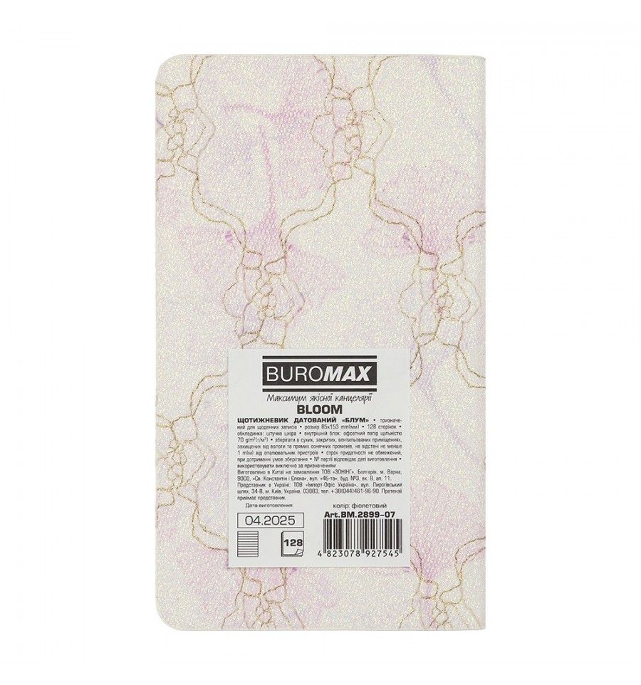 Тижневики BUROMAX - це зручний формат для щотижневого планування своїх ділових та особистих справ.Гнучка обкладинка зі штучної шкіри тижневика BLOOM має стильний та привабливий дизайнерський візерунок та фактурну поверхню, що виблискує на світлі. Гармонійно доповнює дизайн тонований у чорний колір зріз внутрішнього блоку. Кишеньковий розмір тижневика робить його постійним супутником свого власника, він не займе багато місця навіть у маленькій сумці, поміститься до кишені і завжди буде під рукою.Розмір 85х153 мм (кишеньковий) 128 сторінок Внутрішній блок: офсетний папір кремового кольору щільністю 70 г/м² Закладка-лясе в колір обкладинки Друк блоку в 2 кольори: сірий і бордовий Дві мови блоку: українська, англійська Індивідуальна упаковка: картонна коробка Структура внутрішнього блоку:Сторінка для внесення особистої інформації Календарі на 2025 - 2028 роки Інформаційно-довідковий блок: національні, релігійні, професійні свята та пам'ятні дати, знаки зодіаку, телефонні коди мобільних операторів та обласних центрів України, літерні автомобільні коди країн, таблиця відстаней між обласними центрами України, довідник систем вимірювання, міжнародні знаки відповідності, знаки догляду за одягом На одній сторінці горизонтально розміщено три/чотири дні тижня (субота і неділя - вертикальне розташування на одній частині), з організатором часу від 9:00 до 18:00, вказівкою місяця, року, дня тижня та дати Алфавітна книга для внесення контактів Щотижневик BUROMAX - незамінний помічник в плануванні Вашого робочого часу!