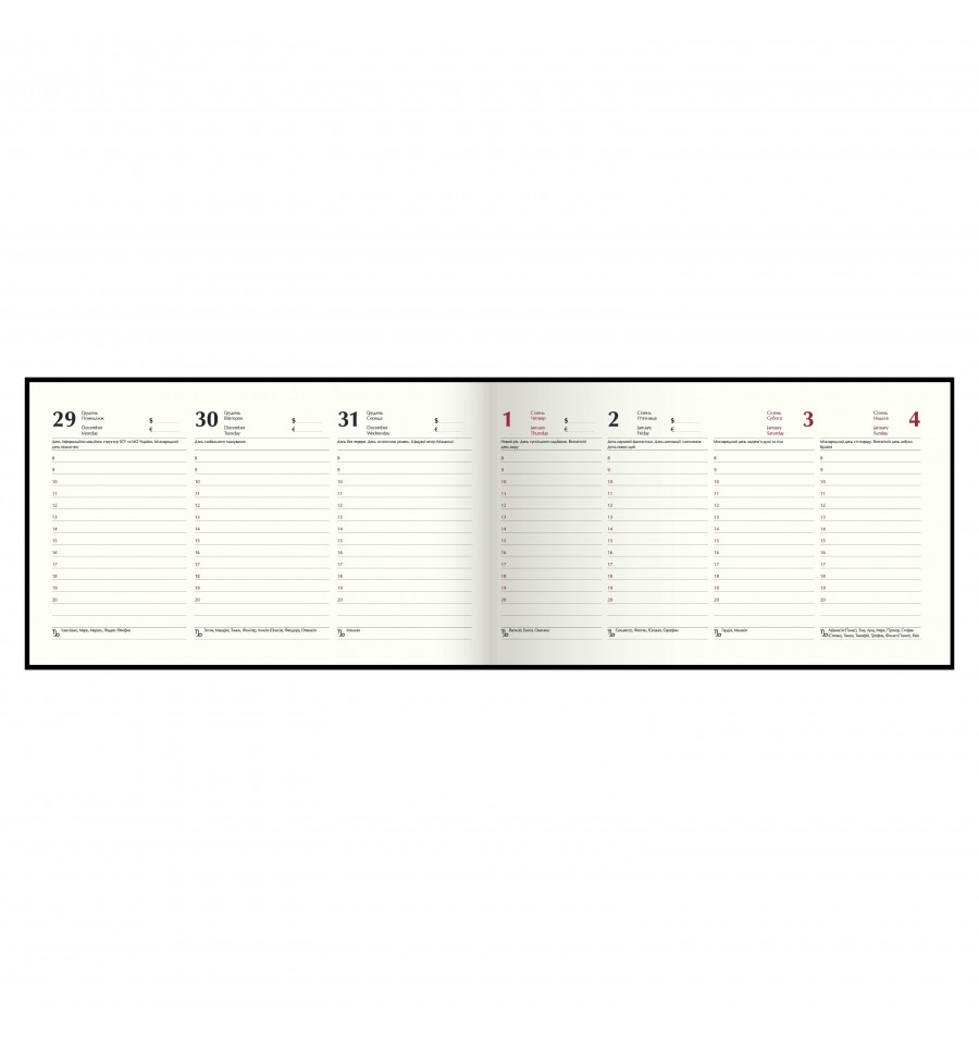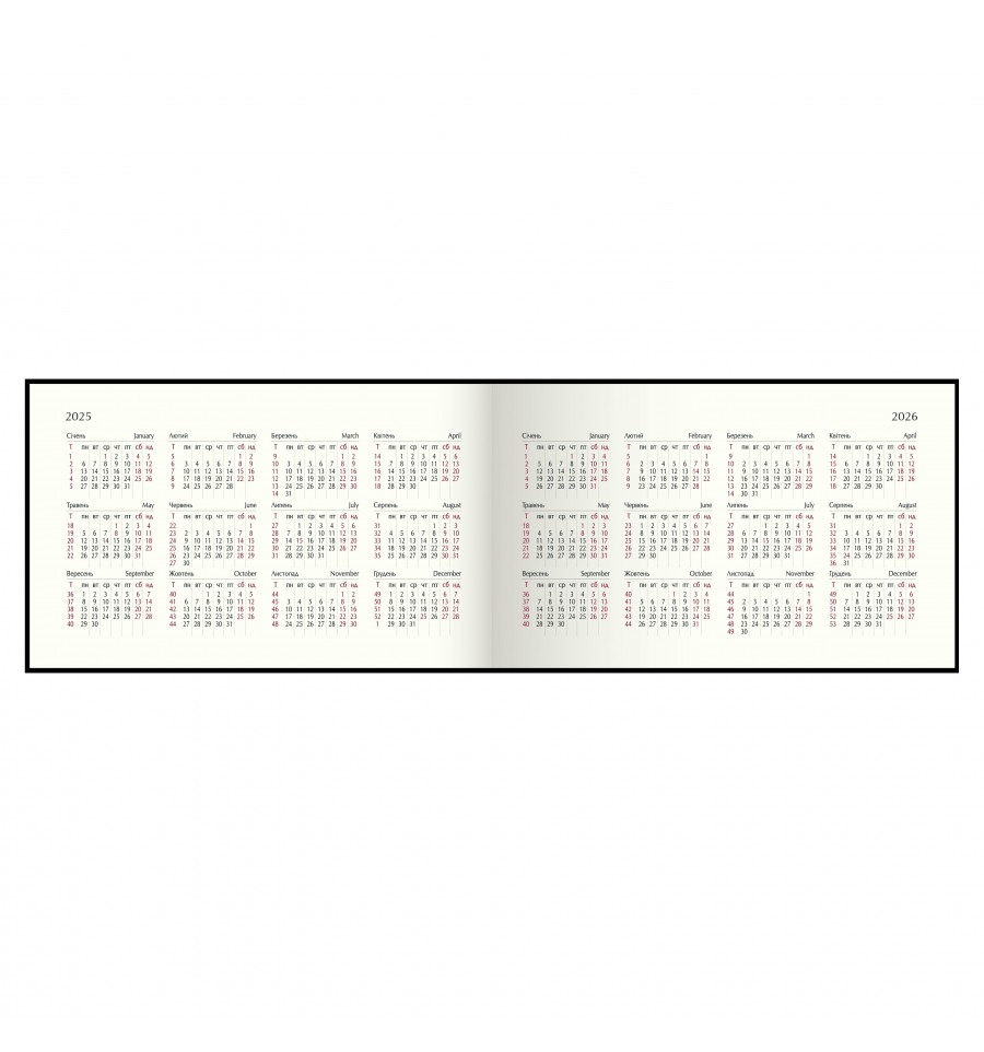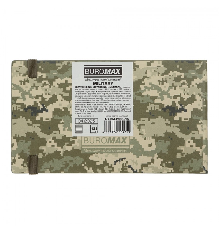 Тижневики BUROMAX - це зручний формат для щотижневого планування своїх ділових та особистих справ.Гнучка обкладинка зі штучної шкіри з покриттям soft touch щотижневика MILITARY виконана в мужньому армійському стилі із зображенням військового шеврону тисненого золотою фольгою. Функціональності щоденнику додають поздовжня гумка, що надійно фіксує щоденник в закритому стані. Гармонійно доповнює дизайн тонований в колір обкладинки зріз внутрішнього блоку. Кишеньковий розмір щотижневика робить його постійним супутником свого власника, він не займе багато місця навіть у маленькій сумці, може вміститися в кишеню і завжди буде під рукою.Розмір 153х87 мм (кишеньковий) 128 сторінок Внутрішній блок: офсетний папір кремового кольору щільністю 70 г/м² Закладка-лясе в колір обкладинки Друк блоку в 2 кольори: сірий і бордовий Дві мови блоку: українська, англійська Індивідуальна упаковка: картонна коробка Структура внутрішнього блоку:Сторінка для внесення особистої інформації Календарі на 2025 - 2027 роки Інформаційно-довідковий блок: національні, релігійні, професійні свята та пам'ятні дати, знаки зодіаку, літерні автомобільні коди країн, таблиця відстаней між обласними центрами України, довідник систем вимірювання, міжнародні знаки відповідності, знаки догляду за одягом На одній сторінці вертикально розміщено три/чотири дні тижня, з організатором часу від 8:00 до 20:00, вказівкою місяця, дня тижня та дати, іменинників, знаку зодіаку, свят та пам'ятних дат Алфавітна книга для внесення контактівЩотижневик BUROMAX - незамінний помічник в плануванні Вашого робочого часу!
