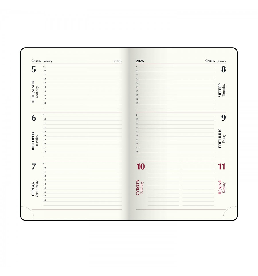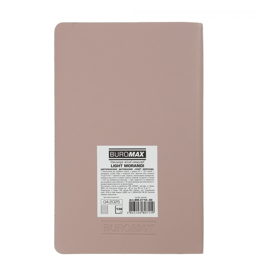 Тижневики BUROMAX - це зручний аксесуар для щотижневого планування своєї ділової та особистої діяльності.Гнучка обкладинка зі штучної шкіри щотижневика LIGHT MORANDI виконана з приємного на дотик матеріалу в легкому кольорі модної палітри "моранді" та має оригінальне сліпе тиснення року на лицьовій стороні. Гармонійно доповнює дизайн тонований в колір обладинки зріз внутрішнього блоку.Формат А5 136 сторінок Внутрішній блок: офсетний папір кремового кольору щільністю 70 г/м² Закладка-лясе в колір обкладинки Перфоровані куточки Друк блоку в 2 кольори: сірий і бордовий Дві мови блоку: українська, англійська Форзаци в колір обкладинки Індивідуальна упаковка: картонна коробка Структура внутрішнього блоку:Аркуш для внесення особистої інформації Календарі на 2025 - 2028 роки Планінг на 2026 рік Інформаційно-довідковий блок: національні, релігійні, професійні свята та пам'ятні дати, знаки зодіаку, телефонні коди мобільних операторів та обласних центрів України, літерні автомобільні коди країн, таблиця відстаней між обласними центрами України, довідник систем вимірювання, міжнародні знаки відповідності, знаки догляду за одягом На одній сторінці горизонтально розміщено три/чотири дні тижня (субота і неділя - вертикальне розташування на одній частині), з організатором часу від 9:00 до 18:00, вказівкою місяця, року, дня тижня та дати Алфавітна книга для внесення контактів Щотижневик BUROMAX - незамінний помічник в плануванні Вашого робочого часу!