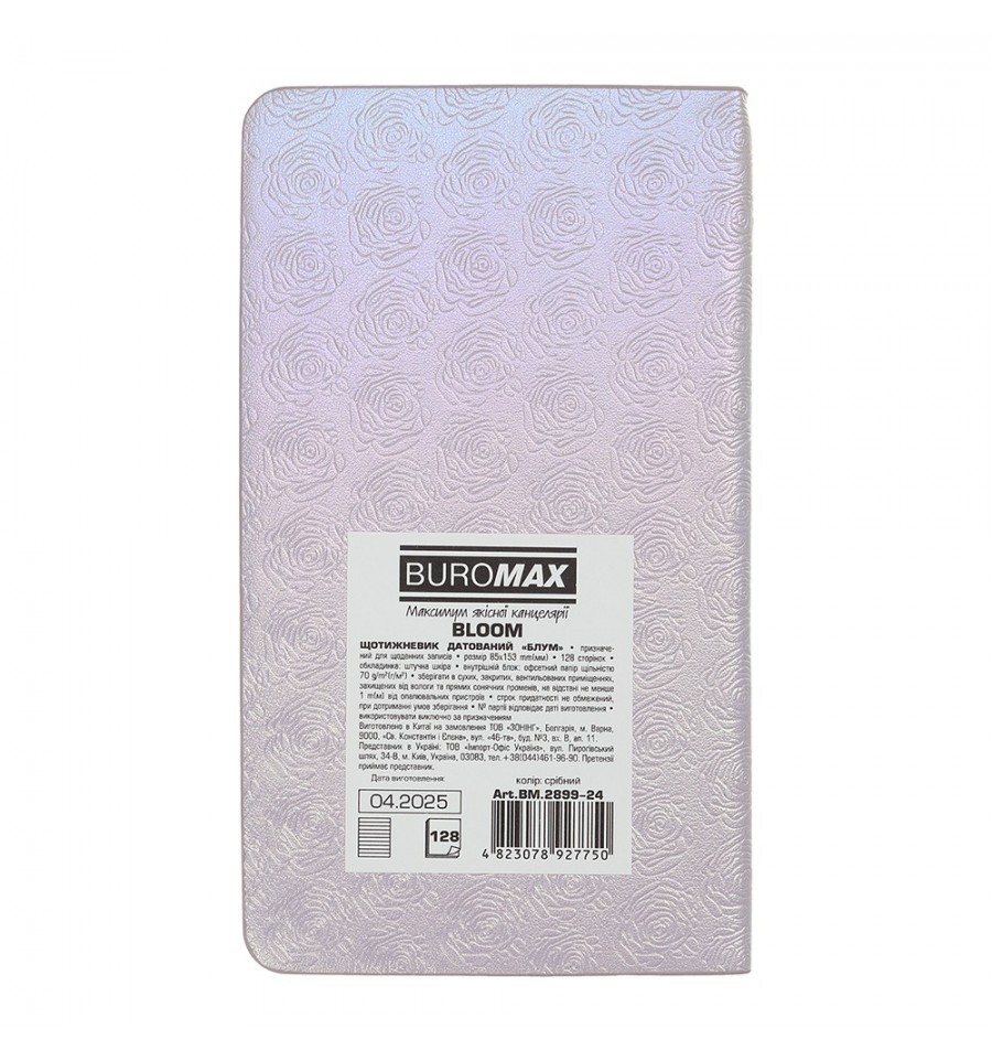 Тижневики BUROMAX - це зручний формат для щотижневого планування своїх ділових та особистих справ.Гнучка обкладинка зі штучної шкіри тижневика BLOOM має стильний та привабливий дизайнерський візерунок та фактурну поверхню, що виблискує на світлі. Гармонійно доповнює дизайн тонований у чорний колір зріз внутрішнього блоку. Кишеньковий розмір тижневика робить його постійним супутником свого власника, він не займе багато місця навіть у маленькій сумці, поміститься до кишені і завжди буде під рукою.Розмір 85х153 мм (кишеньковий) 128 сторінок Внутрішній блок: офсетний папір кремового кольору щільністю 70 г/м² Закладка-лясе в колір обкладинки Друк блоку в 2 кольори: сірий і бордовий Дві мови блоку: українська, англійська Індивідуальна упаковка: картонна коробка Структура внутрішнього блоку:Сторінка для внесення особистої інформації Календарі на 2025 - 2028 роки Інформаційно-довідковий блок: національні, релігійні, професійні свята та пам'ятні дати, знаки зодіаку, телефонні коди мобільних операторів та обласних центрів України, літерні автомобільні коди країн, таблиця відстаней між обласними центрами України, довідник систем вимірювання, міжнародні знаки відповідності, знаки догляду за одягом На одній сторінці горизонтально розміщено три/чотири дні тижня (субота і неділя - вертикальне розташування на одній частині), з організатором часу від 9:00 до 18:00, вказівкою місяця, року, дня тижня та дати Алфавітна книга для внесення контактів Щотижневик BUROMAX - незамінний помічник в плануванні Вашого робочого часу!