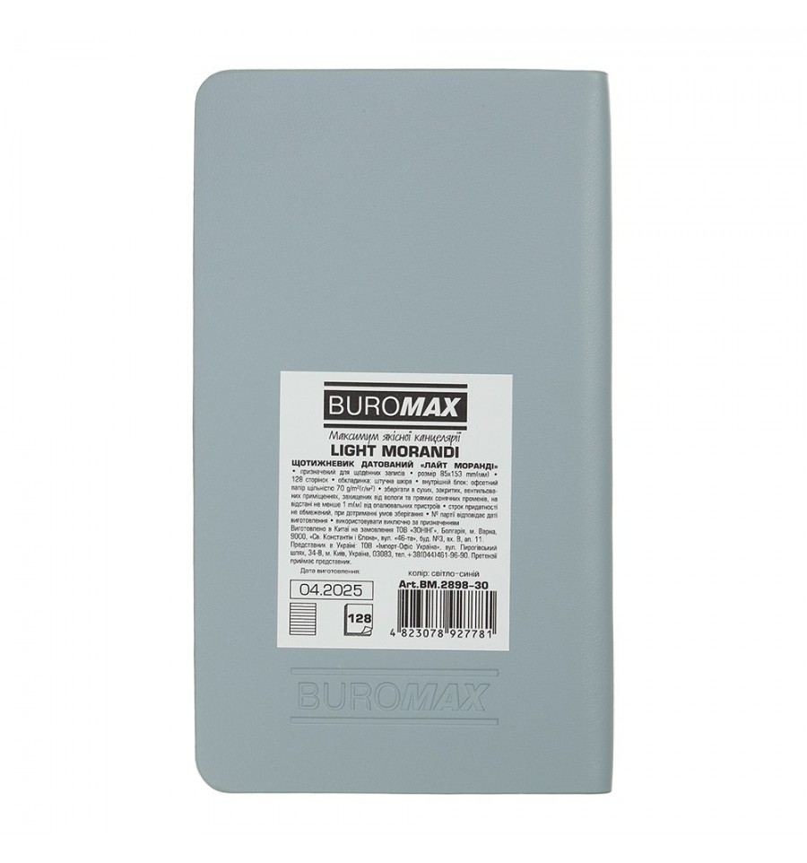 Тижневики BUROMAX - це зручний формат для щотижневого планування своїх ділових та особистих справ.Гнучка обкладинка зі штучної шкіри щотижневика LIGHT MORANDI виконана під натуральну шкіру в легкому кольорі модної палітри "моранді". На лицьовій стороні обкладинки - сліпе тиснення року. Гармонійно доповнює дизайн тонований в колір обкладинки зріз внутрішнього блоку.Розмір 85х153 мм (кишеньковий) 128 сторінок Внутрішній блок: офсетний папір кремового кольору щільністю 70 г/м² Закладка-лясе в колір обкладинки Друк блоку в 2 кольори: сірий і бордовий Дві мови блоку: українська, англійська Індивідуальна упаковка: картонна коробка Структура внутрішнього блоку:Сторінка для внесення особистої інформації Календарі на 2025 - 2028 роки Інформаційно-довідковий блок: національні, релігійні, професійні свята та пам'ятні дати, знаки зодіаку, телефонні коди мобільних операторів та обласних центрів України, літерні автомобільні коди країн, таблиця відстаней між обласними центрами України, довідник систем вимірювання, міжнародні знаки відповідності, знаки догляду за одягом На одній сторінці горизонтально розміщено три/чотири дні тижня (субота і неділя - вертикальне розташування на одній частині), з організатором часу від 9:00 до 18:00, вказівкою місяця, року, дня тижня та дати Алфавітна книга для внесення контактів Щотижневик BUROMAX - незамінний помічник в плануванні Вашого робочого часу!