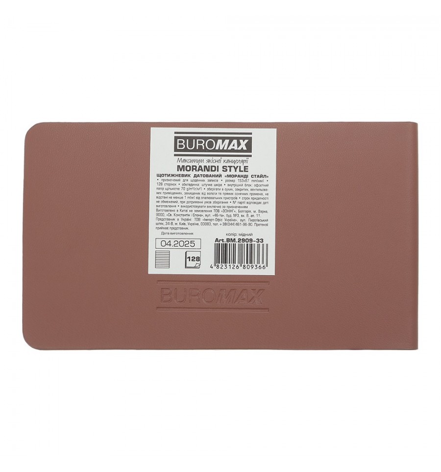 Тижневики BUROMAX - це зручний формат для щотижневого планування своїх ділових та особистих справ.Гнучка обкладинка зі штучної шкіри щотижневика MORANDI STYLE виконана під натуральну фактурну шкіру в кольорі модної палітри "моранді". На лицьовій стороні обкладинки - сліпе тиснення року. Гармонійно доповнює дизайн тонований в колір обкладинки зріз внутрішнього блоку. Кишеньковий розмір щотижневика робить його постійним супутником свого власника, він не займе багато місця навіть у маленькій сумці, може вміститися в кишеню і завжди буде під рукою.Розмір 153х87 мм (кишеньковий) 128 сторінок Внутрішній блок: офсетний папір кремового кольору щільністю 70 г/м² Закладка-лясе в колір обкладинки Друк блоку в 2 кольори: сірий і бордовий Дві мови блоку: українська, англійська Індивідуальна упаковка: картонна коробка Структура внутрішнього блоку:Сторінка для внесення особистої інформації Календарі на 2025 - 2027 роки Інформаційно-довідковий блок: національні, релігійні, професійні свята та пам'ятні дати, знаки зодіаку, літерні автомобільні коди країн, таблиця відстаней між обласними центрами України, довідник систем вимірювання, міжнародні знаки відповідності, знаки догляду за одягом На одній сторінці вертикально розміщено три/чотири дні тижня, з організатором часу від 8:00 до 20:00, вказівкою місяця, дня тижня та дати, іменинників, знаку зодіаку, свят та пам'ятних дат Алфавітна книга для внесення контактівЩотижневик BUROMAX - незамінний помічник в плануванні Вашого робочого часу!