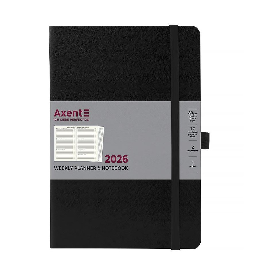 Щотижневик Axent формату А4- із серії Strong з твердою обкладинкою. Використовується для щоденних записів, а також ділових та творчих задач.Тверда обкладинка з вінілу допомагає зберегти акуратний та презентабельний вигляд протягом довгого часу. Якісний кремовий папір щільністю 80 г/м2 добре вбирає чорнило та забезпечує комфортне письмо. Зручно робити записи, креслити та малювати. Щотижневик поділений на 2 частини – датований блок у лінію для зручного планування справ і додаткові сторінки у клітинку для ведення особистих записів.Внутрішній блок українською мовою. Планер містить календар на 2026-2027 рік, загальний тижневий розклад, інформацію про свята, важливі номери телефонів, часові пояси країн світу, одиниці вимірювання, шкалу температур.Дві різнокольорові закладки-ляссе дозволяють швидко знайти та відкрити потрібні сторінки. Еластична тасьма запобігає самовільному відкриванню. Кишеня на форзаці. Містить 96 аркушів, розмір - 195*255 мм.