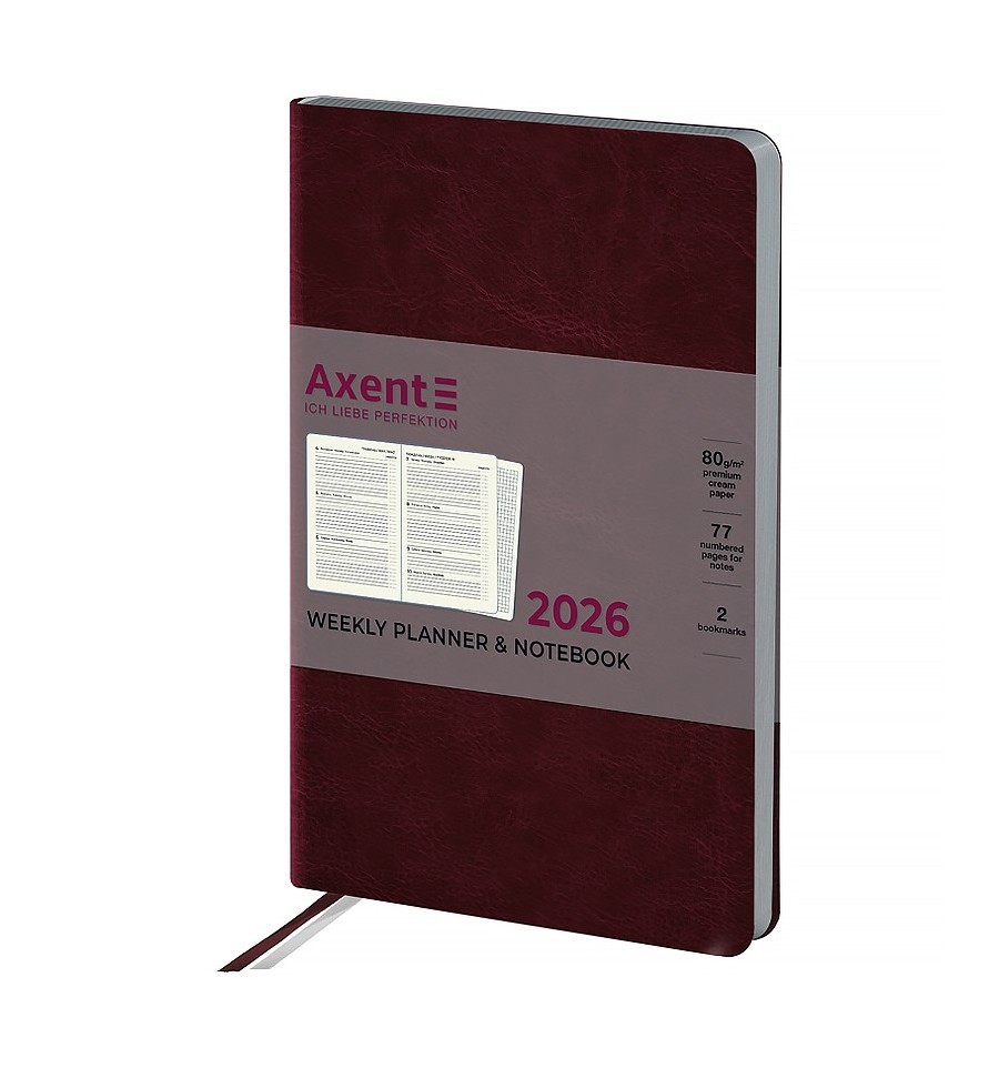 Щотижневик Axent формату А5- із серії City з м'якою обкладинкою та срібним зрізом. Використовується для щоденних записів, а також ділових та творчих задач.М'яка обкладинка з PU-матеріалу допомагає зберегти акуратний та презентабельний вигляд протягом довгого часу. Якісний кремовий папір щільністю 80 г/м2 добре вбирає чорнило та забезпечує комфортне письмо. Щотижневик поділений на 2 частини – датований блок у лінію для зручного планування справ і додаткові сторінки у клітинку для ведення особистих записів.Внутрішній блок українською мовою. Планер містить календар на 2026-2027 рік, загальний тижневий розклад, інформацію про свята, важливі номери телефонів, часові пояси країн світу, одиниці вимірювання, шкалу температур.Дві різнокольорові закладки-ляссе дозволяють швидко знайти та відкрити потрібні сторінки. Містить 96 аркушів, розмір - 125*195 мм. Кишені на форзаці немає. Немає тасьми на обкладинці та петлі для ручки.м