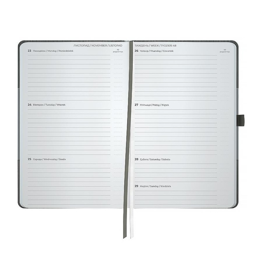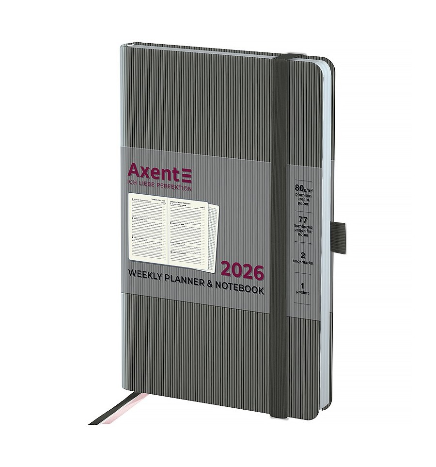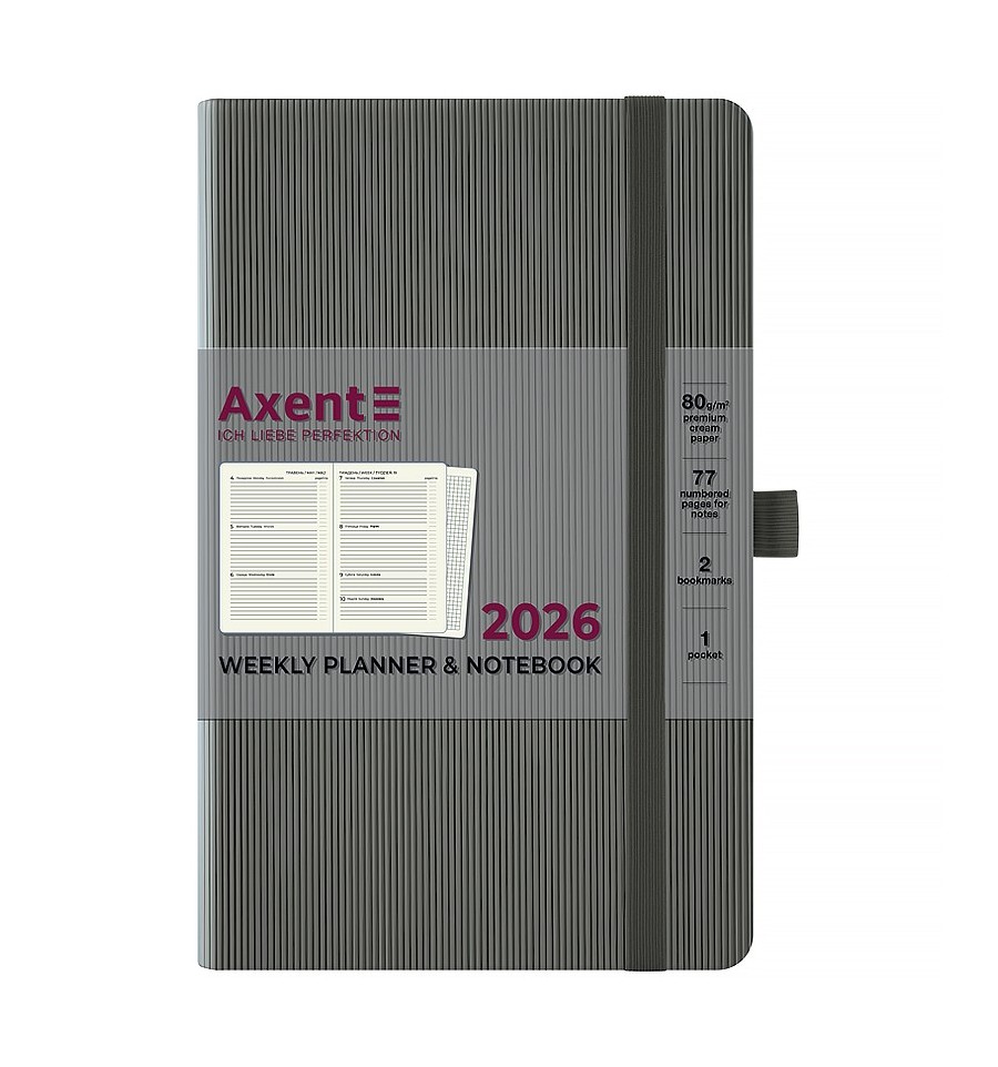 Щотижневик Axent формату А5- із серії Lines з твердою обкладинкою. Використовується для щоденних записів, а також ділових та творчих задач.Тверда обкладинка з PU-матеріалу допомагає зберегти акуратний та презентабельний вигляд протягом довгого часу. Якісний кремовий папір щільністю 80 г/м2 добре вбирає чорнило та забезпечує комфортне письмо. Зручно робити записи, креслити та малювати. Щотижневик поділений на 2 частини – датований блок у лінію для зручного планування справ і додаткові сторінки у клітинку для ведення особистих записів.Внутрішній блок українською мовою. Планер містить календар на 2026-2027 рік, загальний тижневий розклад, інформацію про свята, важливі номери телефонів, часові пояси країн світу, одиниці вимірювання, шкалу температур.Дві різнокольорові закладки-ляссе дозволяють швидко знайти та відкрити потрібні сторінки. Еластична тасьма запобігає самовільному відкриванню. Кишеня на форзаці. Містить 96 аркушів, розмір - 125*195 мм.