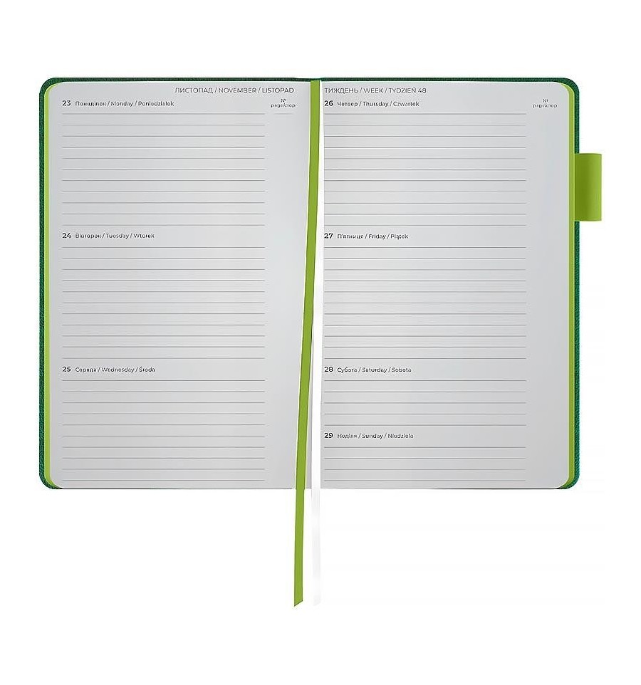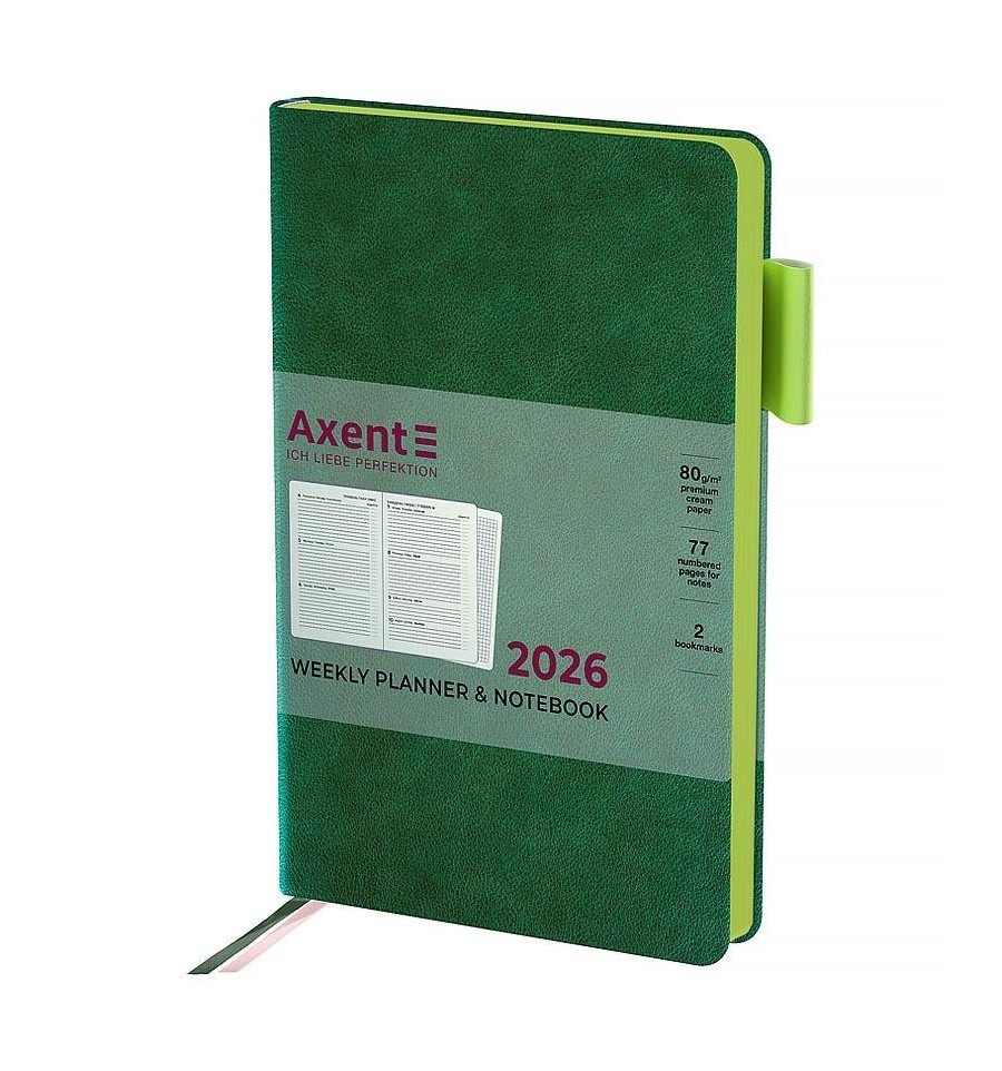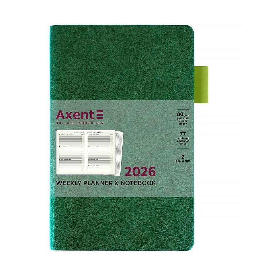 Щотижневик Axent формату А5- із серії Muse з м'якою обкладинкою та кольоровим зрізом. Використовується для щоденних записів, а також ділових та творчих задач.М'яка обкладинка з PU-матеріалу допомагає зберегти акуратний та презентабельний вигляд протягом довгого часу. Якісний кремовий папір щільністю 80 г/м2 добре вбирає чорнило та забезпечує комфортне письмо. Щотижневик поділений на 2 частини – датований блок у лінію для зручного планування справ і додаткові сторінки у клітинку для ведення особистих записів.Внутрішній блок українською мовою. Планер містить календар на 2026-2027 рік, загальний тижневий розклад, інформацію про свята, важливі номери телефонів, часові пояси країн світу, одиниці вимірювання, шкалу температур.Дві різнокольорові закладки-ляссе дозволяють швидко знайти та відкрити потрібні сторінки. Містить 96 аркушів, розмір - 125*195 мм. Кишені на форзаці немає. Немає тасьми на обкладинці. Є петля для ручки.