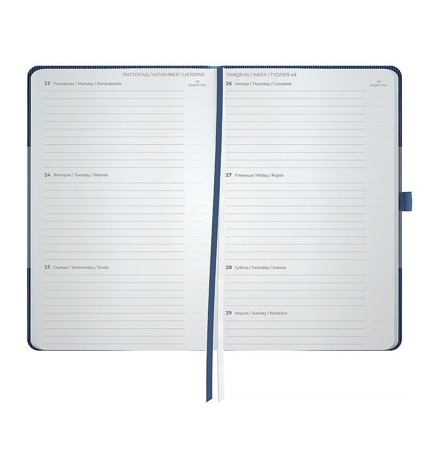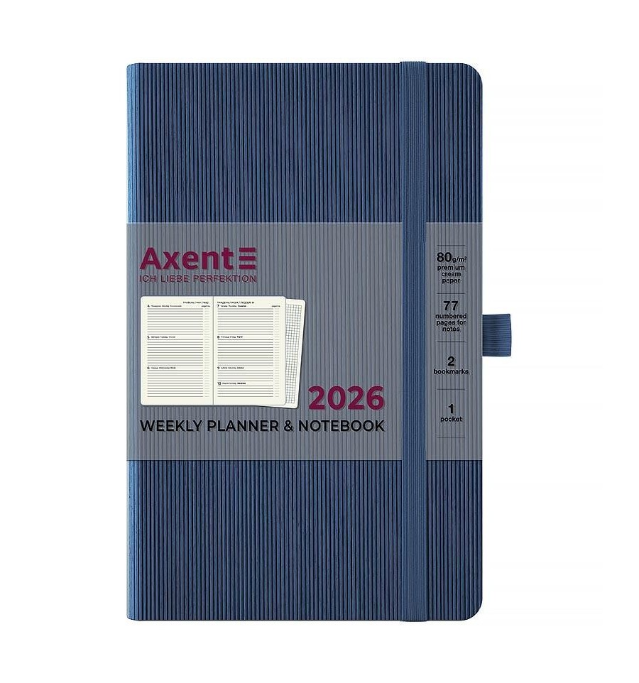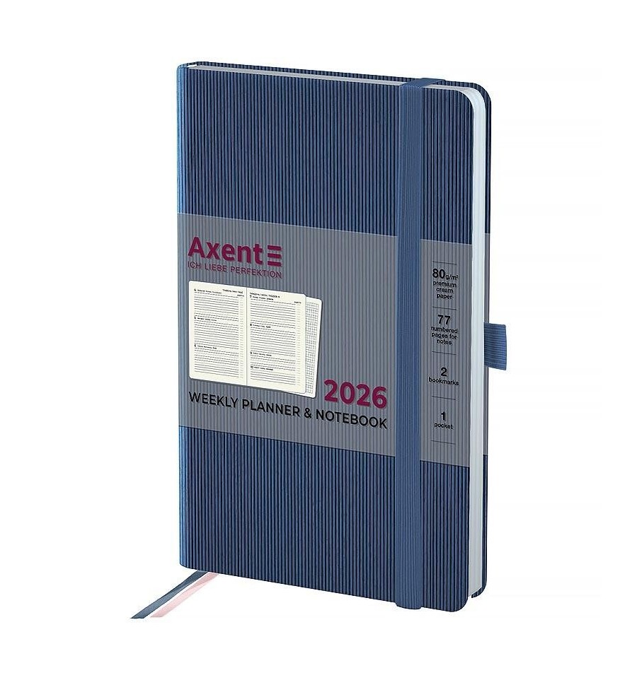Щотижневик Axent формату А5- із серії Lines з твердою обкладинкою. Використовується для щоденних записів, а також ділових та творчих задач.Тверда обкладинка з PU-матеріалу допомагає зберегти акуратний та презентабельний вигляд протягом довгого часу. Якісний кремовий папір щільністю 80 г/м2 добре вбирає чорнило та забезпечує комфортне письмо. Зручно робити записи, креслити та малювати. Щотижневик поділений на 2 частини – датований блок у лінію для зручного планування справ і додаткові сторінки у клітинку для ведення особистих записів.Внутрішній блок українською мовою. Планер містить календар на 2026-2027 рік, загальний тижневий розклад, інформацію про свята, важливі номери телефонів, часові пояси країн світу, одиниці вимірювання, шкалу температур.Дві різнокольорові закладки-ляссе дозволяють швидко знайти та відкрити потрібні сторінки. Еластична тасьма запобігає самовільному відкриванню. Кишеня на форзаці. Містить 96 аркушів, розмір - 125*195 мм.