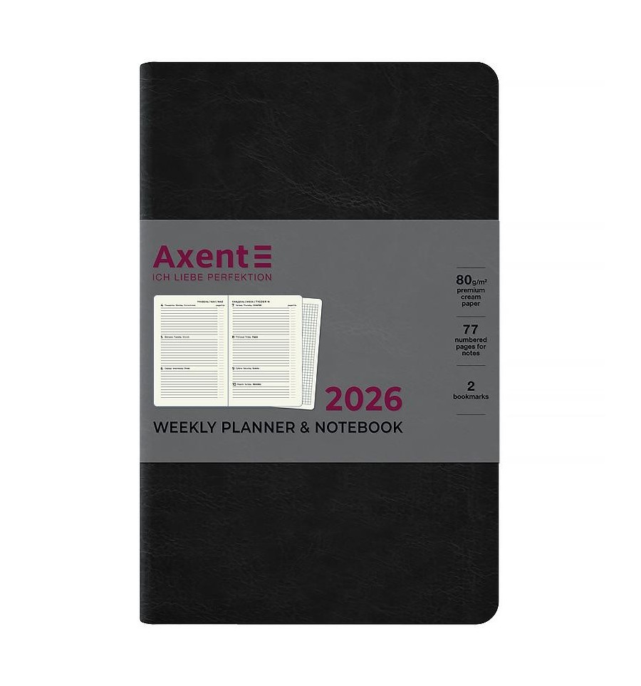 Щотижневик Axent формату А5- із серії City з м'якою обкладинкою та срібним зрізом. Використовується для щоденних записів, а також ділових та творчих задач.М'яка обкладинка з PU-матеріалу допомагає зберегти акуратний та презентабельний вигляд протягом довгого часу. Якісний кремовий папір щільністю 80 г/м2 добре вбирає чорнило та забезпечує комфортне письмо. Щотижневик поділений на 2 частини – датований блок у лінію для зручного планування справ і додаткові сторінки у клітинку для ведення особистих записів.Внутрішній блок українською мовою. Планер містить календар на 2026-2027 рік, загальний тижневий розклад, інформацію про свята, важливі номери телефонів, часові пояси країн світу, одиниці вимірювання, шкалу температур.Дві різнокольорові закладки-ляссе дозволяють швидко знайти та відкрити потрібні сторінки. Містить 96 аркушів, розмір - 125*195 мм. Кишені на форзаці немає. Немає тасьми на обкладинці та петлі для ручки.м