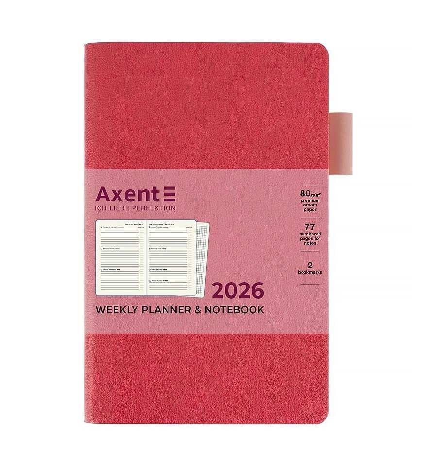Щотижневик Axent формату А5- із серії Muse з м'якою обкладинкою та кольоровим зрізом. Використовується для щоденних записів, а також ділових та творчих задач.М'яка обкладинка з PU-матеріалу допомагає зберегти акуратний та презентабельний вигляд протягом довгого часу. Якісний кремовий папір щільністю 80 г/м2 добре вбирає чорнило та забезпечує комфортне письмо. Щотижневик поділений на 2 частини – датований блок у лінію для зручного планування справ і додаткові сторінки у клітинку для ведення особистих записів.Внутрішній блок українською мовою. Планер містить календар на 2026-2027 рік, загальний тижневий розклад, інформацію про свята, важливі номери телефонів, часові пояси країн світу, одиниці вимірювання, шкалу температур.Дві різнокольорові закладки-ляссе дозволяють швидко знайти та відкрити потрібні сторінки. Містить 96 аркушів, розмір - 125*195 мм. Кишені на форзаці немає. Немає тасьми на обкладинці. Є петля для ручки.