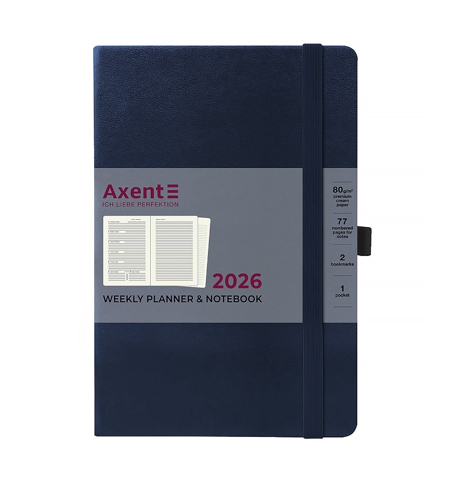Зручний щотижневик Axent із серії Strong в твердій обкладинці. Використовується для щоденних записів, а також ділових та творчих задач.Тверда обкладинка з вінілу допомагає зберегти акуратний та презентабельний вигляд протягом довгого часу. Якісний кремовий папір щільністю 80 г/м2 добре вбирає чорнило та забезпечує комфортне письмо. Зручно робити записи, креслити та малювати. Щотижневик поділений на 2 частини – датований блок у лінію для зручного планування справ і додаткові сторінки в лінію для ведення особистих записів.Внутрішній блок українською мовою. Планер містить календар на 2026-2027 рік, загальний тижневий розклад, інформацію про свята, важливі номери телефонів, часові пояси країн світу, одиниці вимірювання, шкалу температур.Дві різнокольорові закладки-ляссе дозволяють швидко знайти та відкрити потрібні сторінки. Кишеня на форзаці. Містить 96 аркушів, розмір - 145*210 мм.