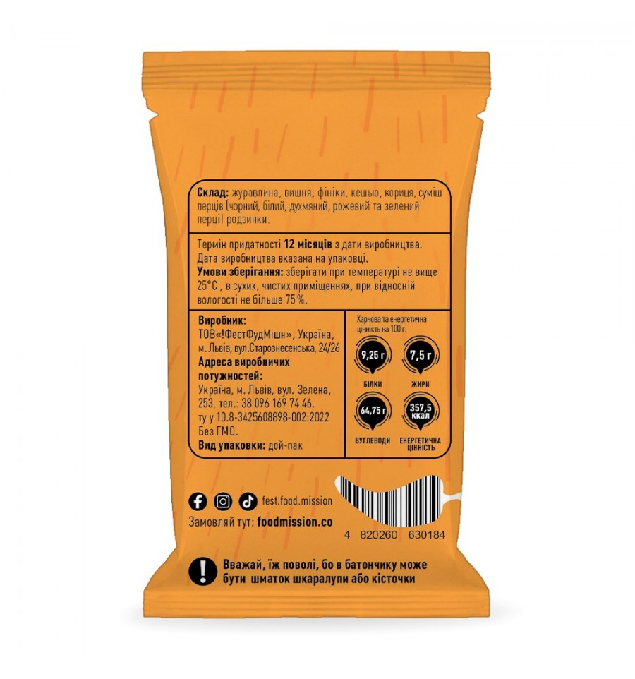 Прості, натуральні та смачні. Батончики на основі рослинних компонентів - горіхів, сухофруктів та прянощів. Без цукру, цукрозамінників та глютену. На кожен день та для кожного члена сім'ї. Користь для організму та смакове задоволення для мозку.Склад:журавлина, вишня, фініки, кеш'ю, кориця, суміш перців, родзинки. Харчова та енергетична цінність на 100г: білки 9,25г, жири 7,5г, вуглеводи 64,75г Енергетична цінність: 357,5Ккал Вага 40г Термін придатності 12 місяців з дати виробництва.