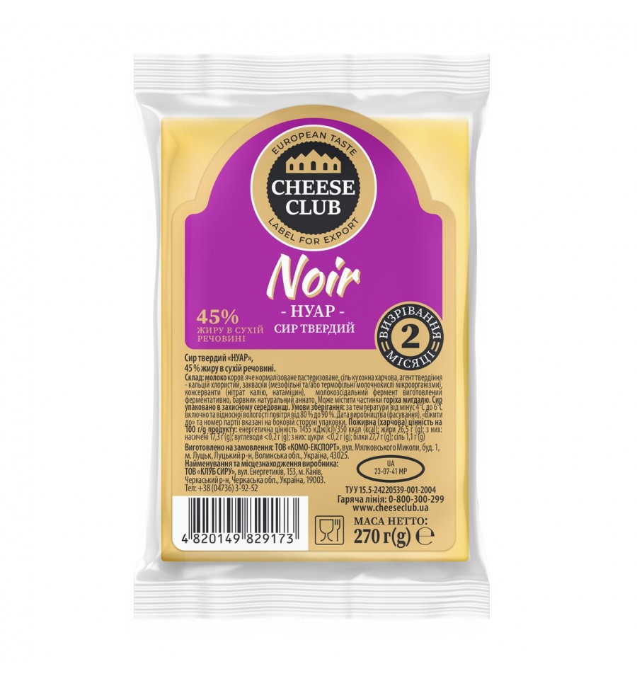 Сир твердий "НУАР" 45% жиру в сухій речовині, брусок 270 г. Склад: молоко коров`яче нормалізоване пастеризоване, сіль кухонна харчова, агент твердіння - кальцій хлористий, закваски (мезофільні та/або термофільні молочнокислі мікроорганізми), консерванти (нітрат калію, натаміцин), молокозсідальний фермент виготовлений ферментативно, барвник натуральний аннато. Може містити частинки горіха миндаля. Калорійність в 100г продукту: 1455 кДж (kJ) / 350 ккал (kcal). Харчова (поживна) цінність у 100 г продукту: жири –26,5 г (g), з них насичені – 17,3 г (g); вуглеводи – <0,2 г (g), з них цукри – <0,2 г (g); білки –27,7 г (g); сіль – 1,1 г (g). Умови зберігання та строки придатності: зберігати за температури від -4 °С до 6 °С та відносній вологості повітря від 80 % до 90 %. Строк придатності сирів фасованих з моменту відкривання герметичного пакування за температури зберігання не вище 6°С та відносної вологості повіт-ря від 80% до 90% включно- не більше ніж 5 діб, щільно загорнутим у плівку, що дозволена для контакту з харчовими продуктами центральним органом влади у сфері державного нагляду за дотриманням санітарного законодавства. Виробник: ТОВ "КЛУБ СИРУ". Країна виробництва: Україна. Адреса виробничих потужностей: Енергетиків, 153, м. Канів, Черкаський р-н, Черкаська обл., Україна, 19003 Тел: +38 (04736) 3-92-52. Експлуатаційний дозвіл: 23-07-41 МР. Вміст ГМО: не містить вказаної речовини. Маса нетто: 270 г. Термін придатності : 120 діб.