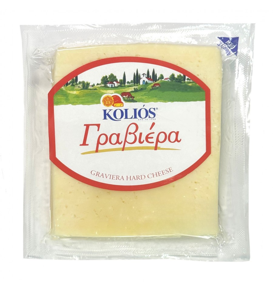 Твердий сир Graviera. Маса нетто: 250 г. Вміст жиру у сухій речовині не менше 45%. Вологість, не більше 38%. Склад: пастеризоване коров`яче молоко, сіль, закваска, сичужний фермент. Країна походження молока: Австрія. Харчова цінність на 100 г: Енергетична цінність: 1600 кДж / 385 ккал. Жири - 29 г, з них насичені - 19 г, Вуглеводи - 0 г, з них цукри - 0 г, Білки - 31 г, Сіль - 4 г. Зберігати в холодильнику при температурі +2°C та +6°C. Термін придатності: див. на етикетці. Після відкриття зберігати в холодильнику та спожити протягом 3 днів. Вироблено в Австрії (AT 60149 EG) та упаковано KOLIOS S.A. GREEK DAIRY, Лімнотопос 61200, Греція. Імпортер/отримувач претензій: ТОВ "РОСТІМ АГРО", вул. Аграрна,1а, с. Білогородка, Бучанський район, Київська область, Україна. Телефон: +380 (66) 211 16 34, e-mail: bg.2005.kiev@gmail.com.