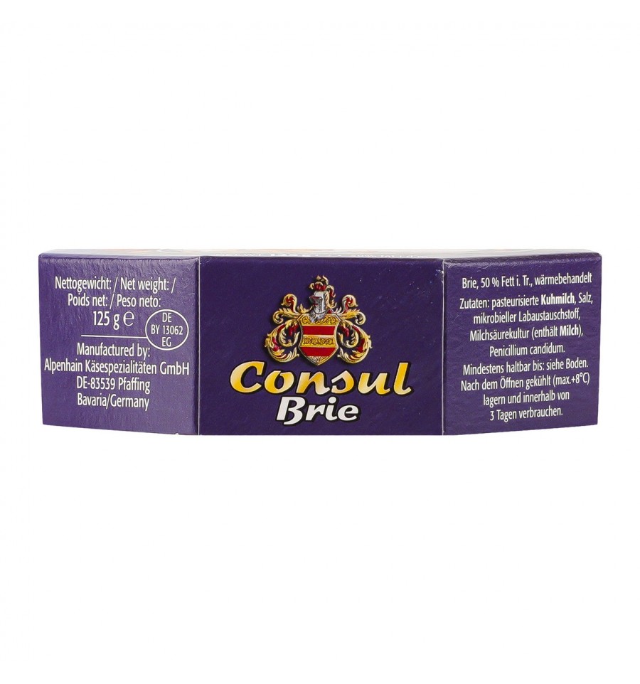 Сир Брі 50%,ТМ Консул,0,125кг. Склад: пастеризоване коров`яче МОЛОКО,сіль кухонна харчова,молочнокислі бактерії (містить МОЛОКО),сичужний фермент,культури благородної цвілі (Penicillium candidum). Калорійність в 100г продукту: 297 ккал.,1231 кДж. Харчова (поживна) цінність у 100г продукту: Білки - 18г.,Жири - 25г,Вуглеводи - 1г. Умови зберігання: зберігати за температури від 0°C до 8°C - 365 днів. Зберігати в холодильнику. Виробник: Альпенхайн. Країна виробництва: Німеччина. Адреса виробничих потужностей: Alpenhain Kasespezialitaten-Werk Gmbh & Co. KG,D-83539,Lehen,24,Oberbayern,Germanyl. Вміст ГМО: Не містить вказаної речовини. Маса нетто: 0,125кг