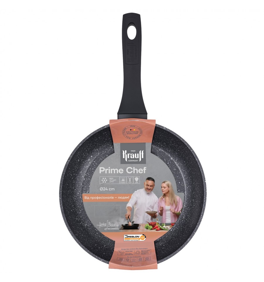 Сковорода алюм.з антипригарним мармуровим покриттям, діам.24см. Виготовляється із алюмінію, ручка бакелітова з soft touch покриттям. Відповідає вимогам діючого санітарного законодавства України.Не потребує обов’язкової сертифікації. Не містить шкідливих речовин. Призначена для використання за призначенням у побуті. Не використовувати абразивні миючі засоби. Виготовлено за технологією Krauff GmbH, Germany Ostendstraße 204, 90482, Nürnberg, Germany адреса виробничих потужностей: Нінбо Голден Элефан Кітченвар Ко, ЛТД, Циувон, Лонгшан таун, Сіксі Сіті, Нінбо, Жейжианг, КНР. Дата виготовлення: серпень 2025р. Строк придатності: необмежений при дотриманні правил використання від виробника. Умови зберігання: Не потребує особливих умов зберігання Продавець та підприємство, яке здійснює функції виробника товару щодо прийняття претензій від споживачів в Україні: ТОВ «ТГ«ТНП» Адреса: пр-т Слобожанський, 31Д, м. Дніпро, 49083, Україна e-mail: office@tnp.com.ua тел: 0800 339 683"